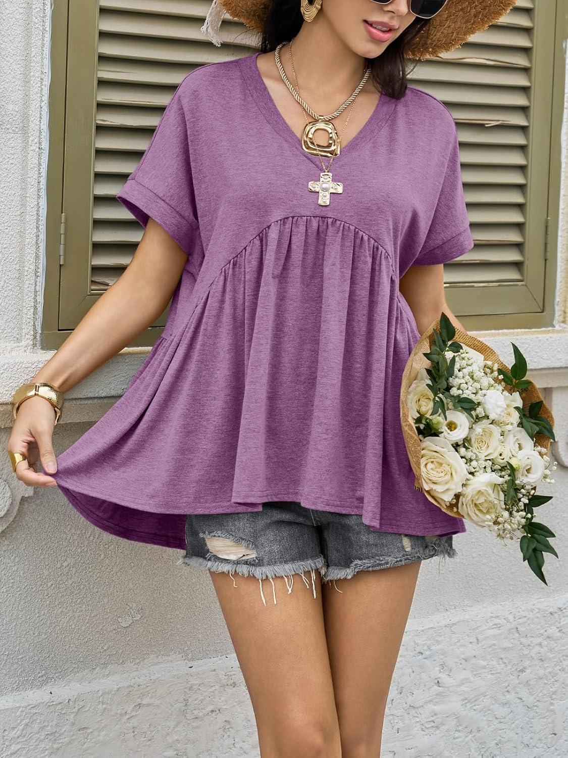 Cicy Bell Womens Summer Peplum Tops Oversized Babydoll Short Sleeve V Neck T Shirts Casual Loose Pleated Swing Blouse(Purple)