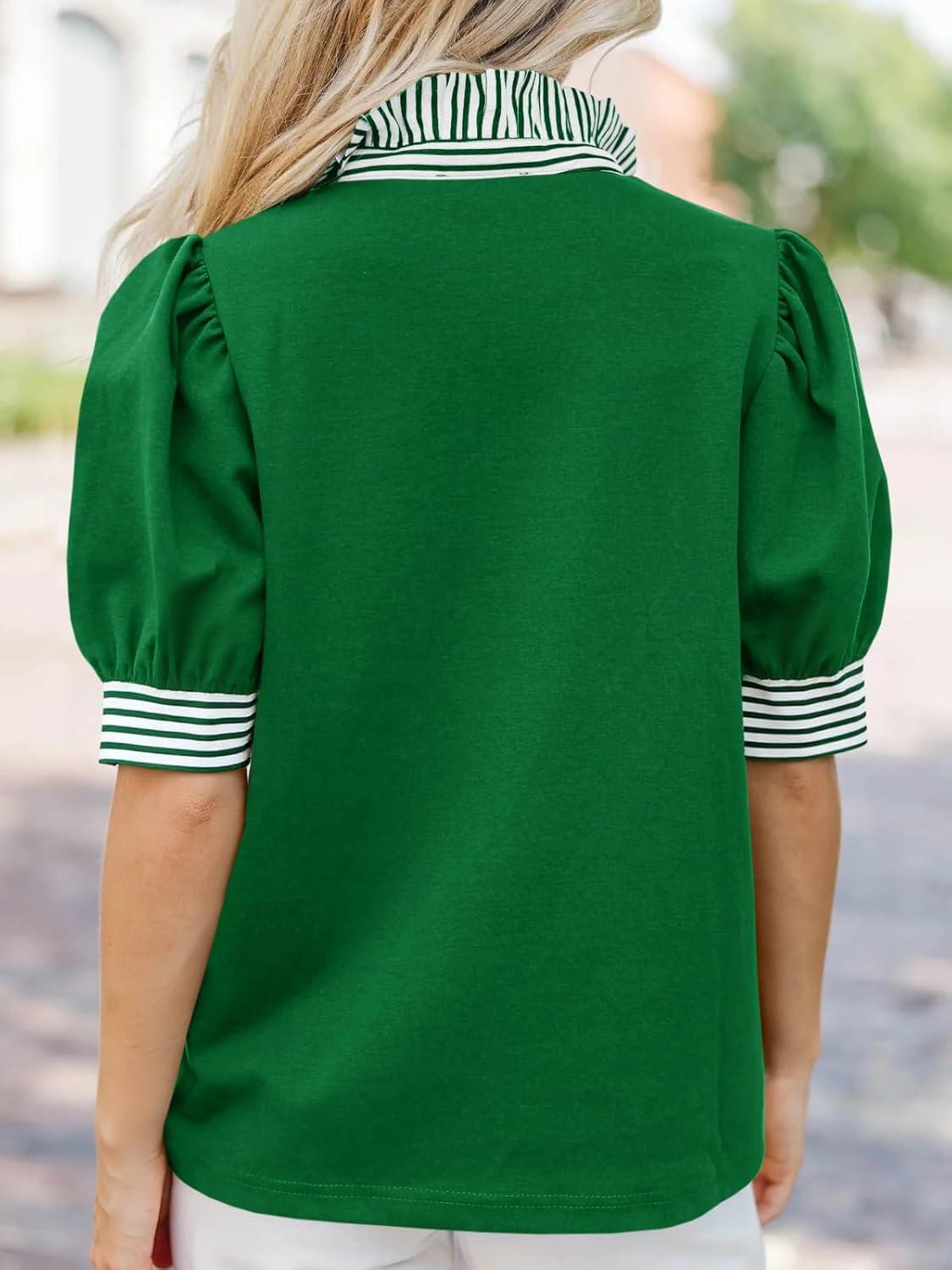 Cicy Bell Womens Summer Puff Sleeve Blouses Casual Dressy Ruffle V Neck Tops Color Block Striped Loose Fit Button Polo Shirts(Green)