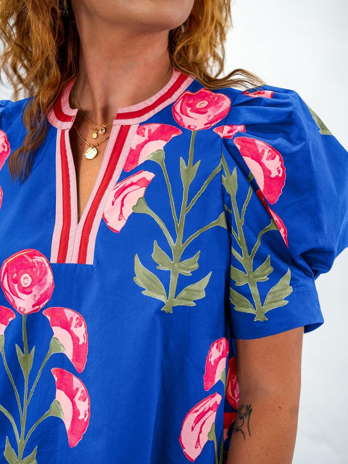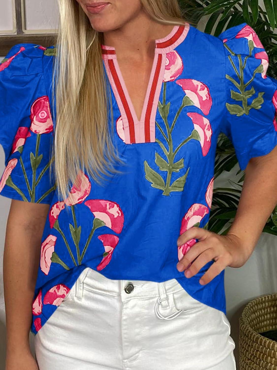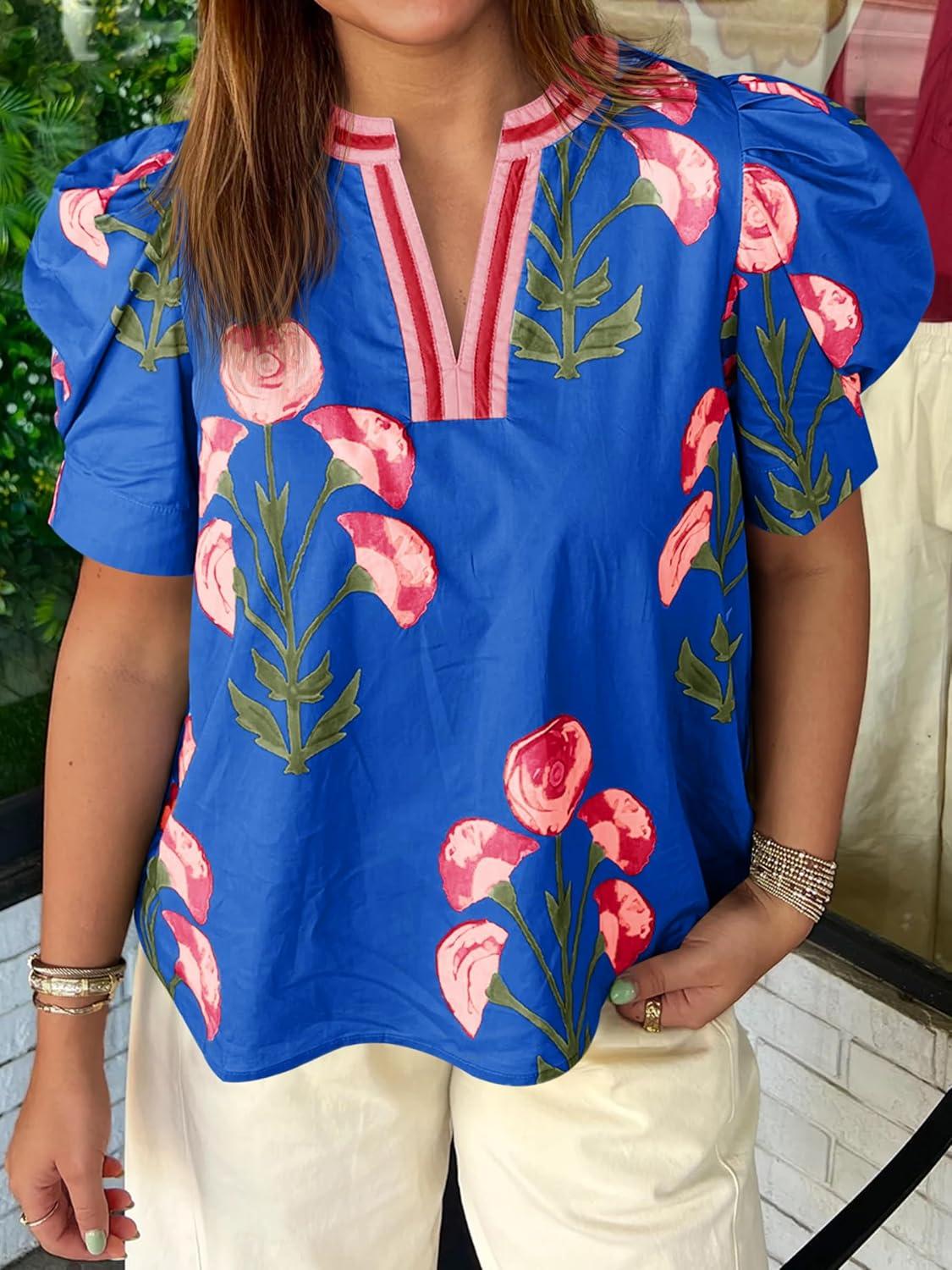 Cicy Bell Womens Summer Puff Sleeve Blouses Casual Dressy V Neck Color Block Tops Loose Fit Boho Floral Printed Tee Shirts(Blue)