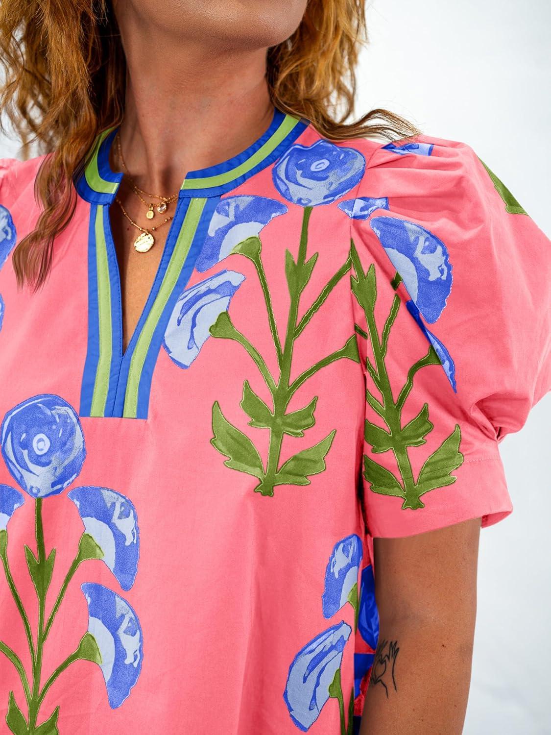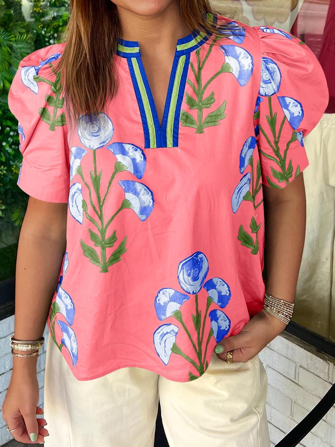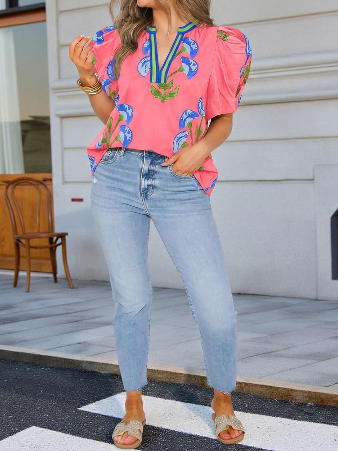 Cicy Bell Womens Summer Puff Sleeve Blouses Casual Dressy V Neck Color Block Tops Loose Fit Boho Floral Printed Tee Shirts(Pink)