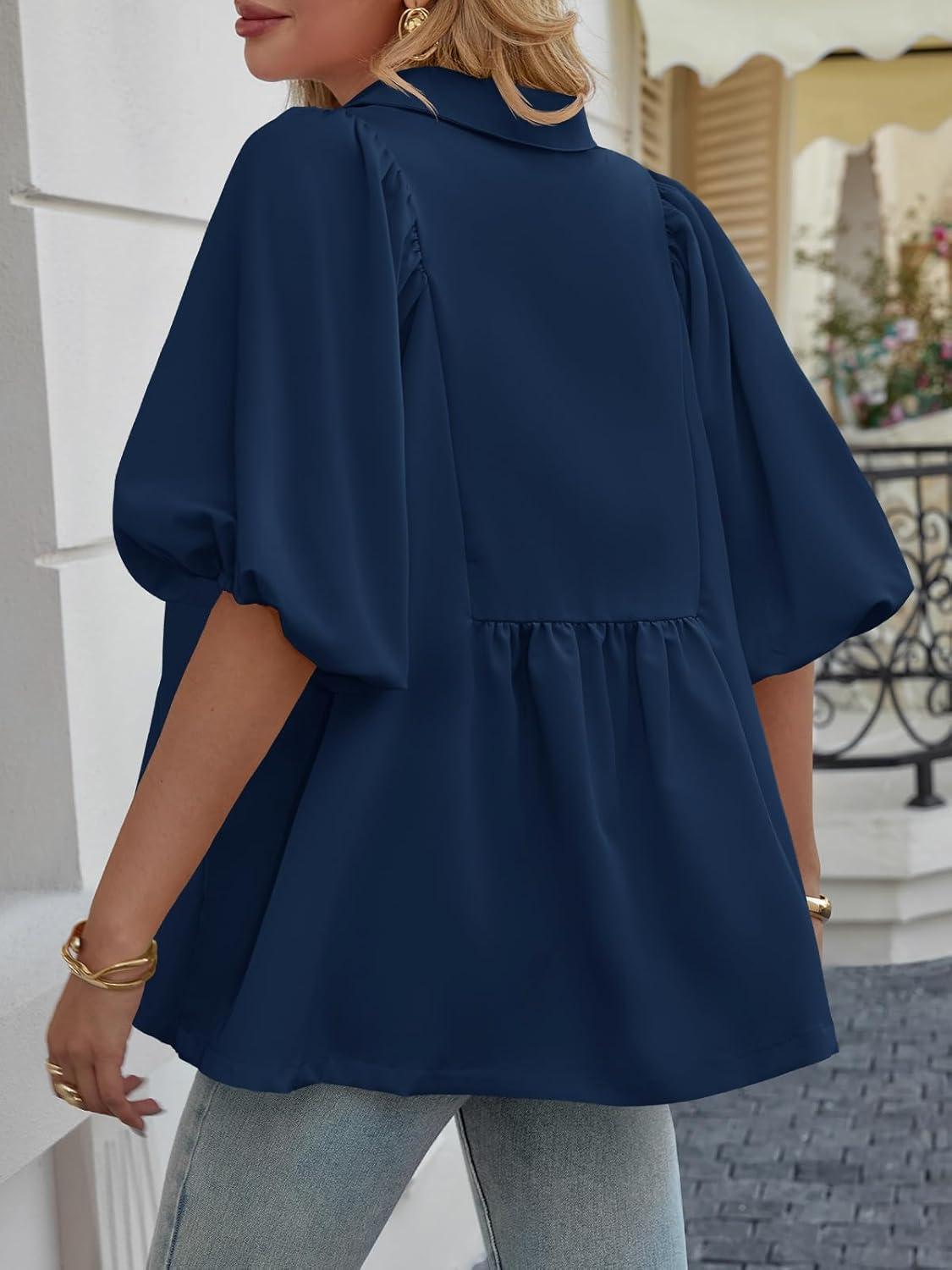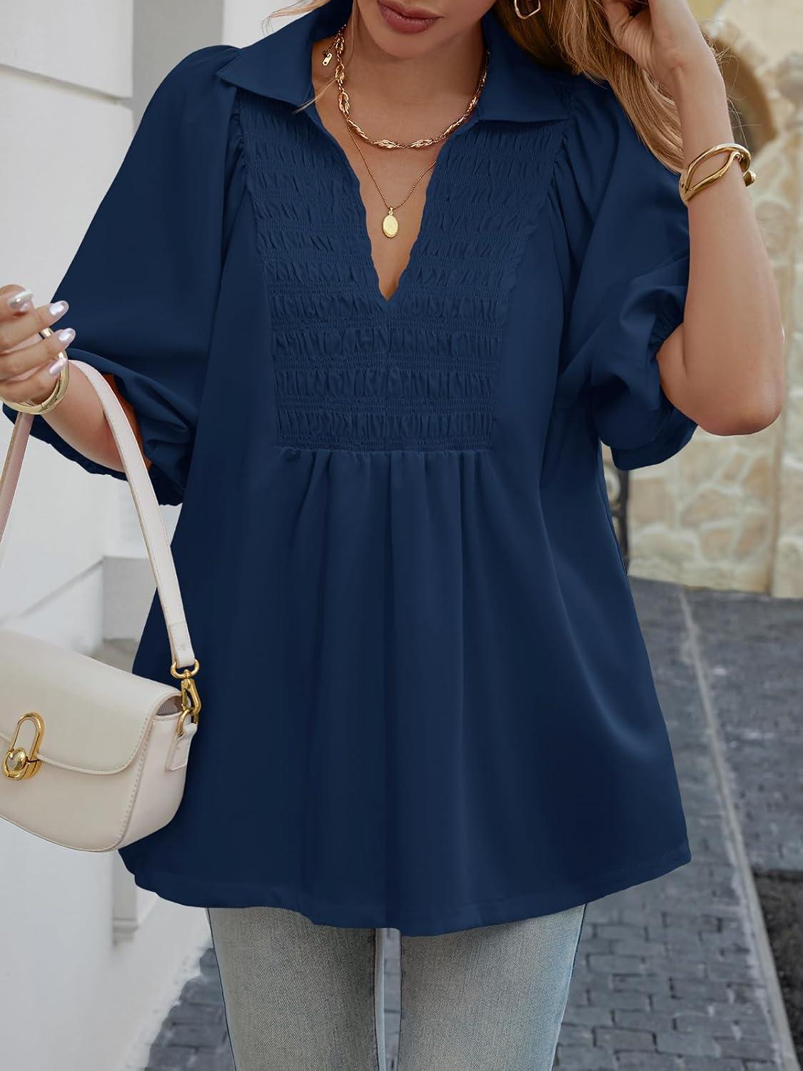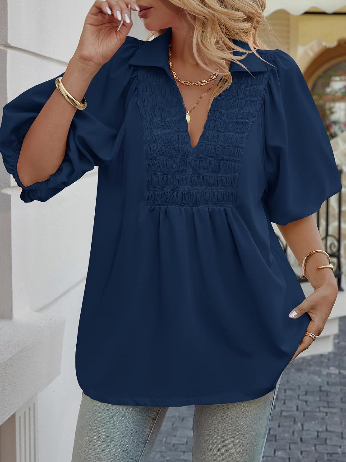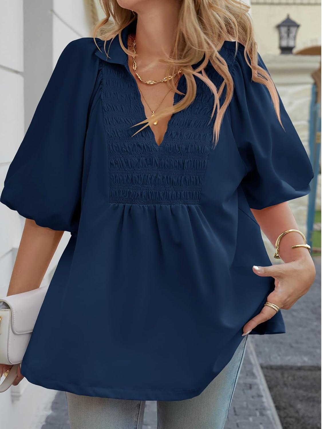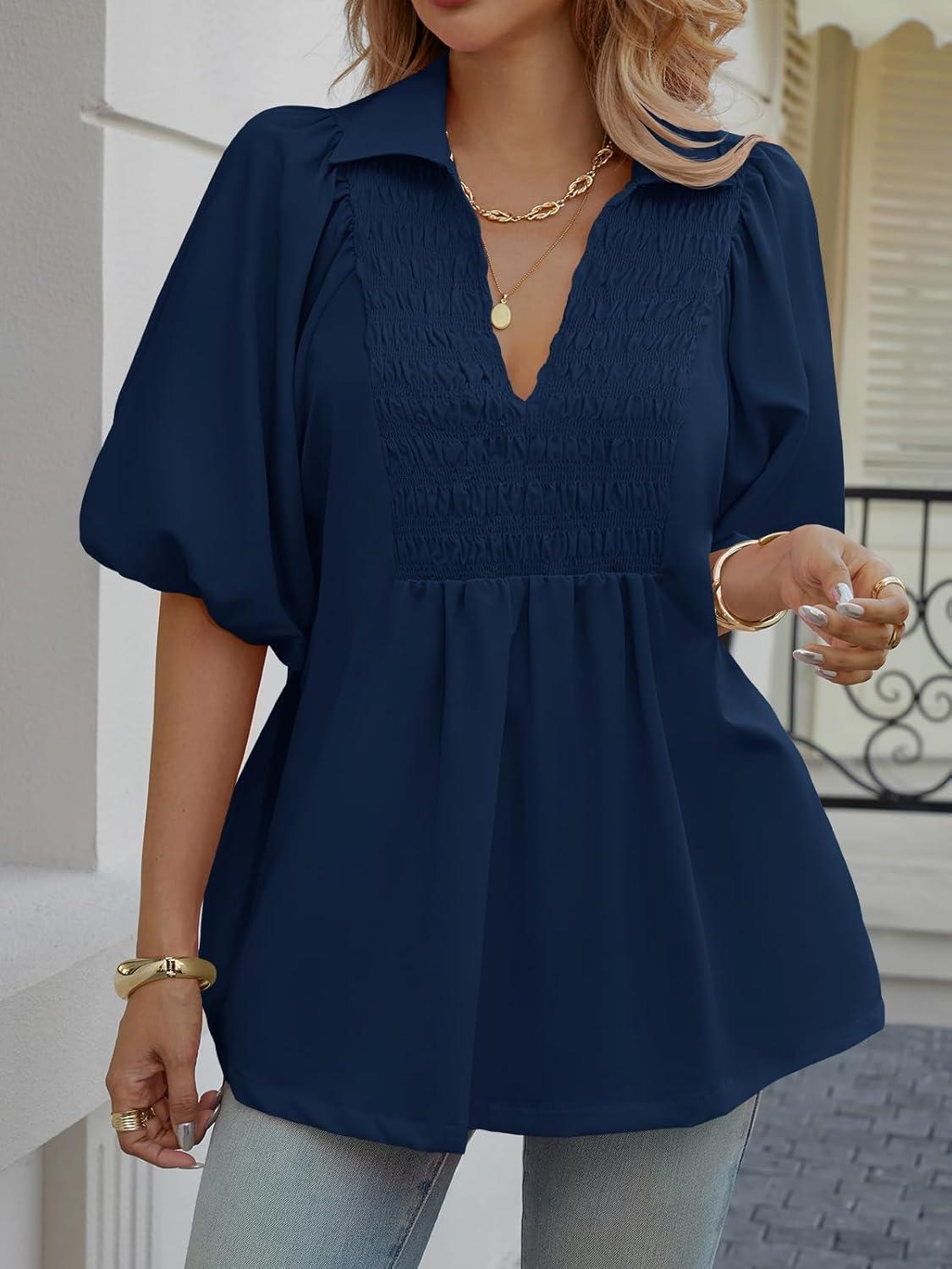 Cicy Bell Womens Summer Puff Sleeve Blouses Smocked V Neck Babydoll Peplum Casual Tunic Tops Loose Fit Pleated Shirts(Navy)