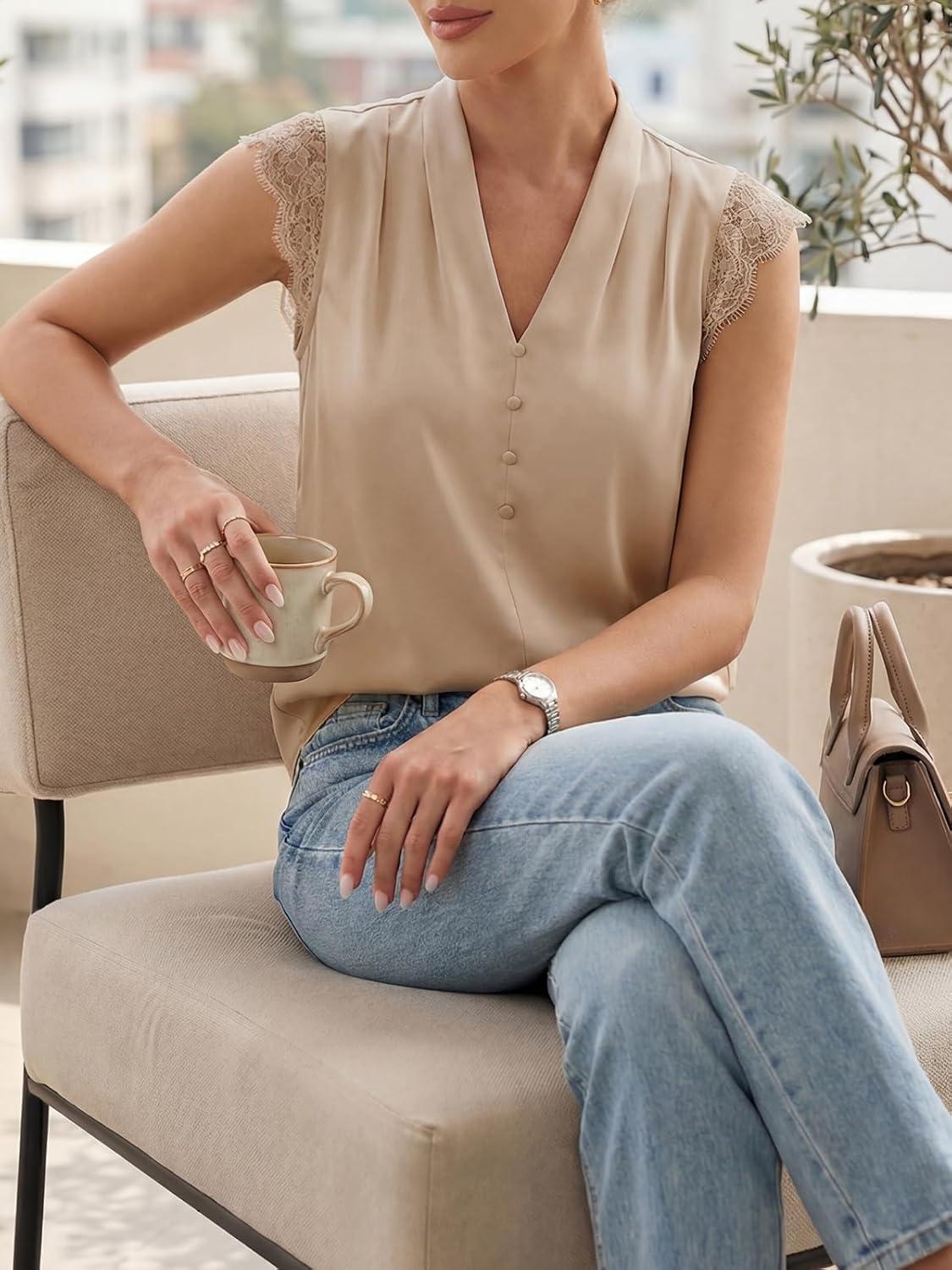 imageCicy Bell Womens Summer Silk Satin Tank Tops Lace Cap Sleeve V Neck Casual Dressy Shirt Loose Fit Button Work BlouseCamel