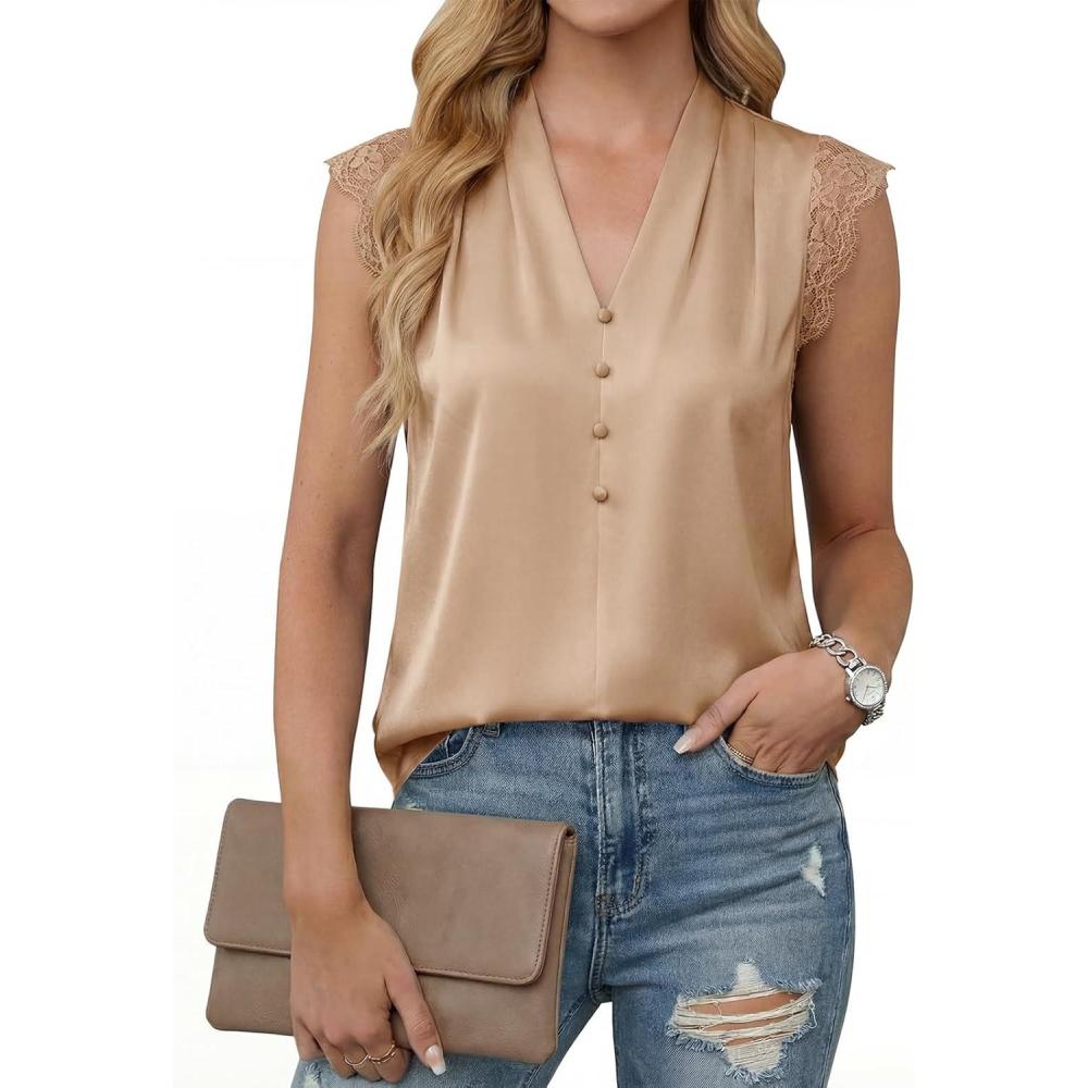 Cicy Bell Womens Summer Silk Satin Tank Tops Lace Cap Sleeve V Neck Casual Dressy Shirt Loose Fit Button Work Blouse(Camel)