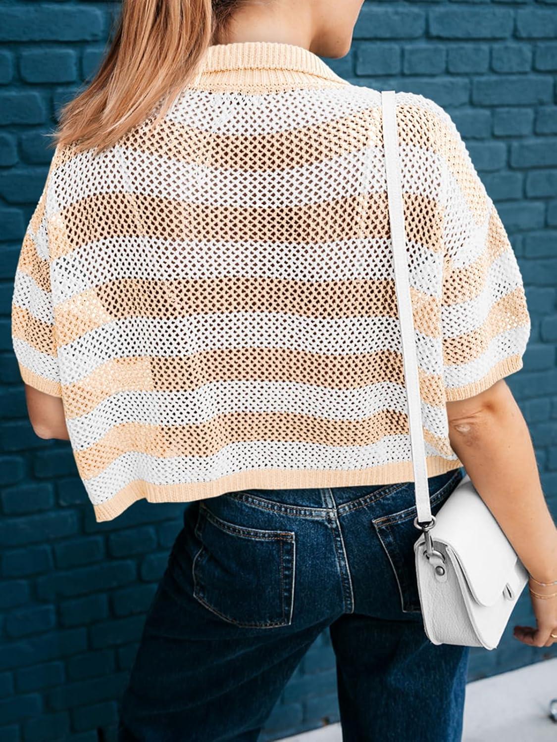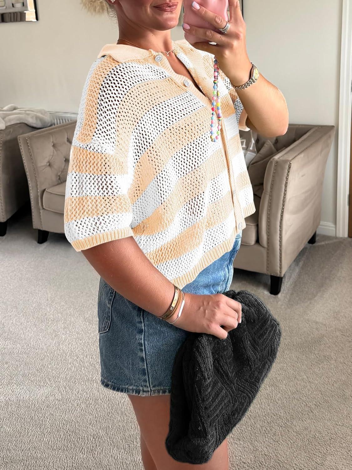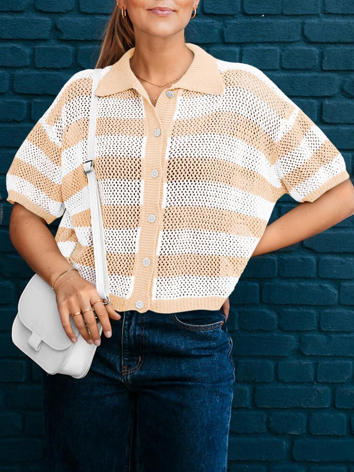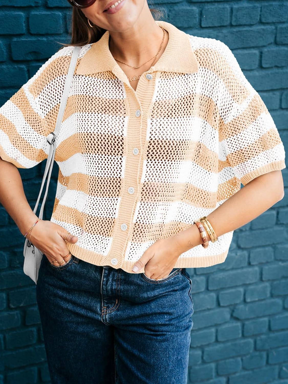 Cicy Bell Womens Summer Striped Crochet Cardigan Sweater Half Sleeve Button up Tops Loose Fit Cover Up(Beige)