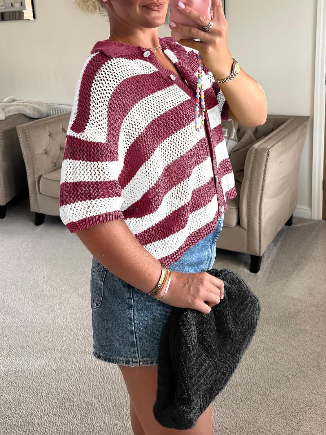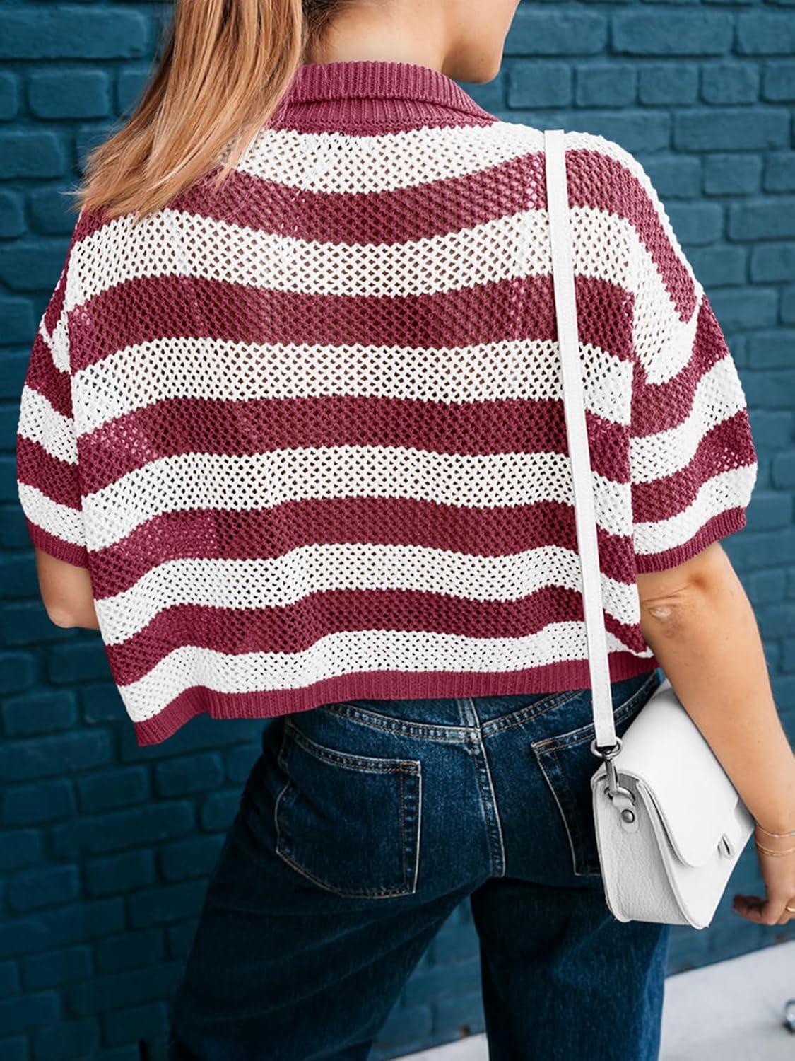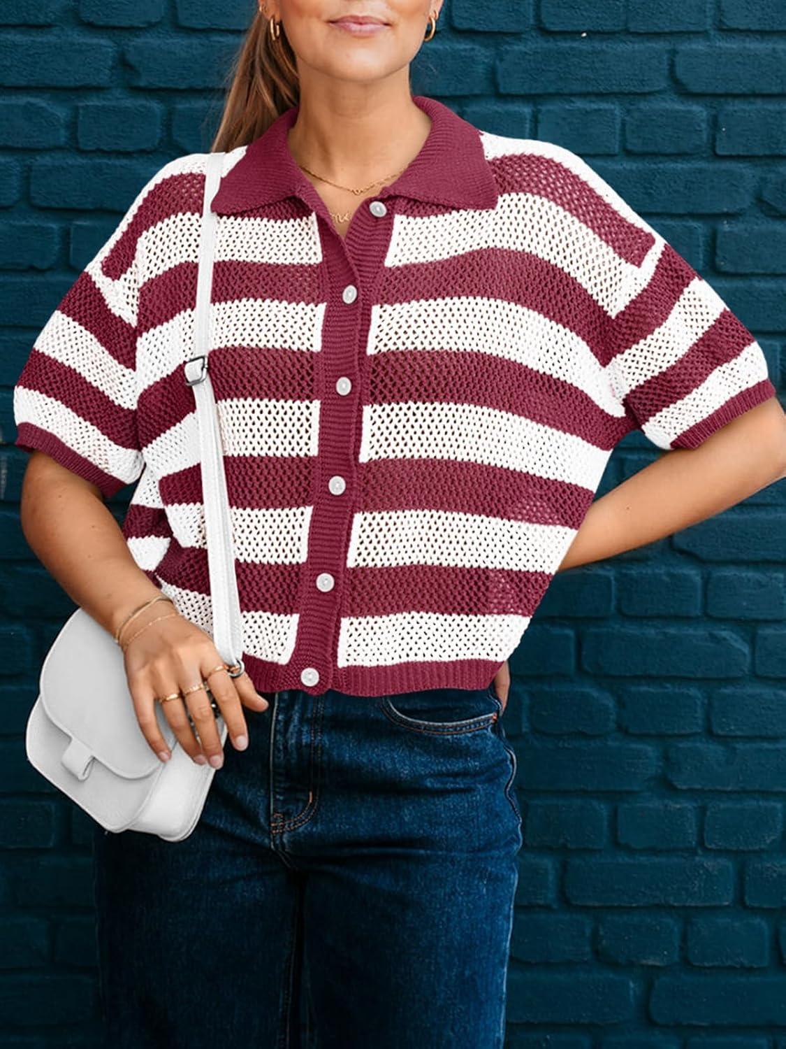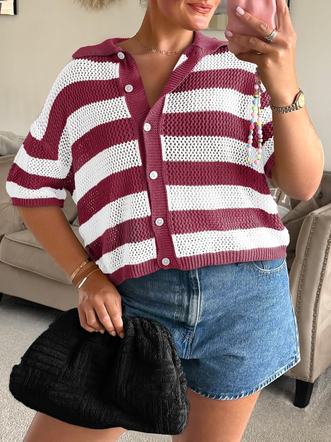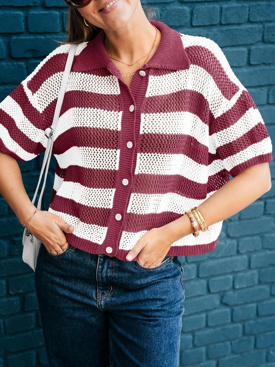 Cicy Bell Womens Summer Striped Crochet Cardigan Sweater Half Sleeve Button up Tops Loose Fit Cover Up(Burgundy)