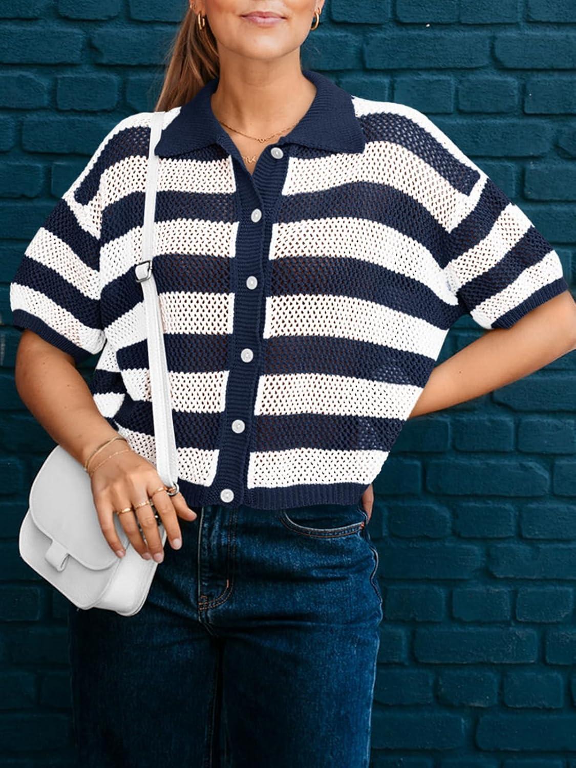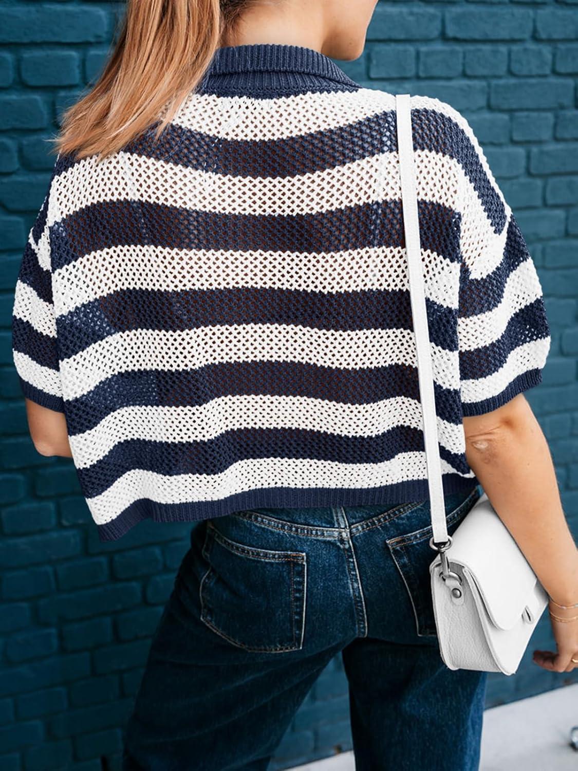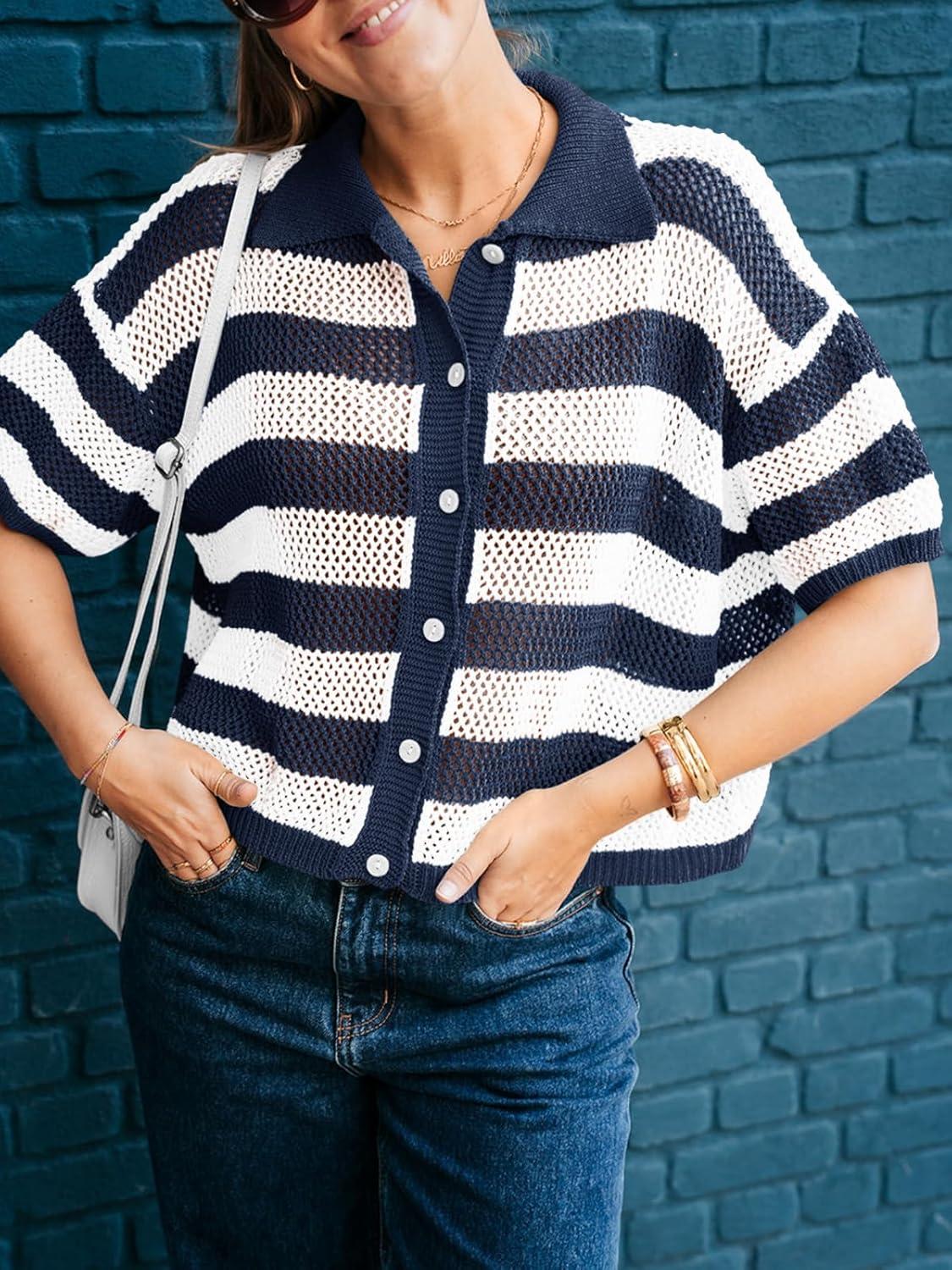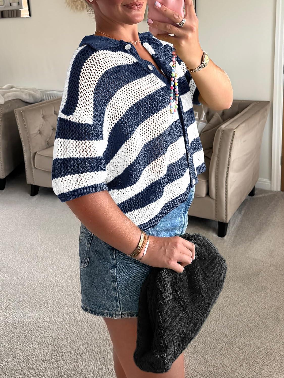 Cicy Bell Womens Summer Striped Crochet Cardigan Sweater Half Sleeve Button up Tops Loose Fit Cover Up(Navy)