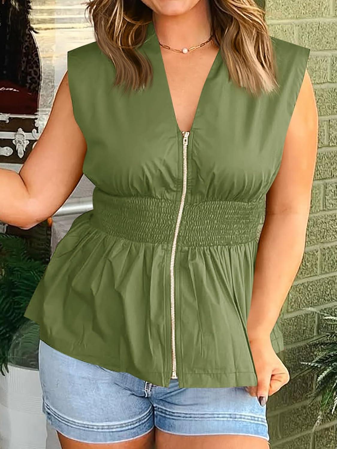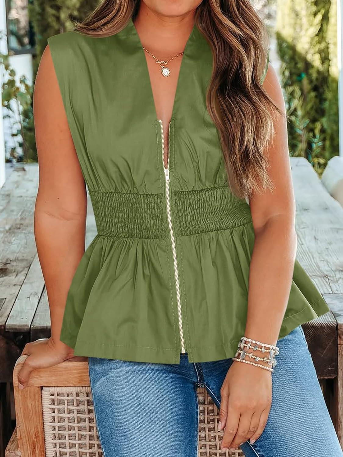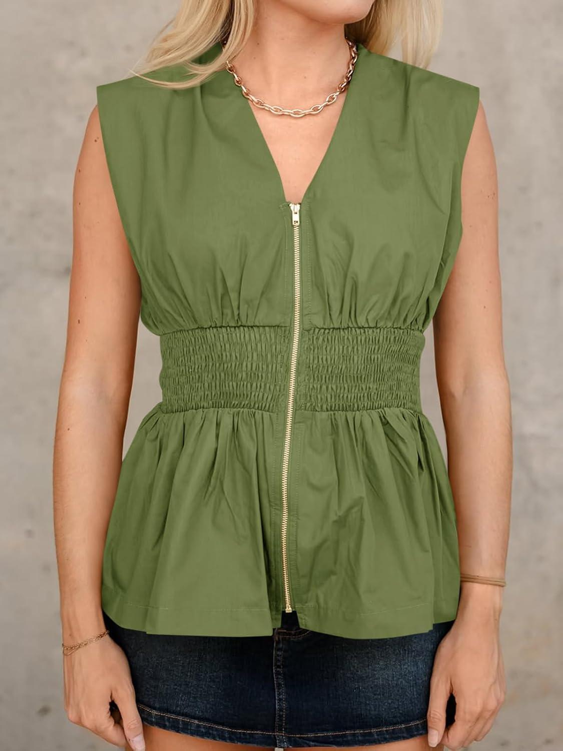 Cicy Bell Womens Summer V Neck Tank Tops Smocked Zipper Sleeveless Vest Pleated Peplum Shirts(Army Green)