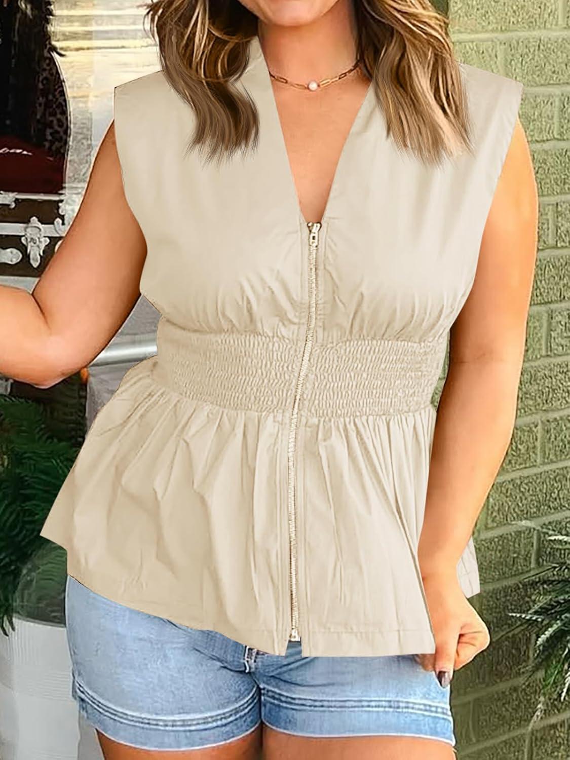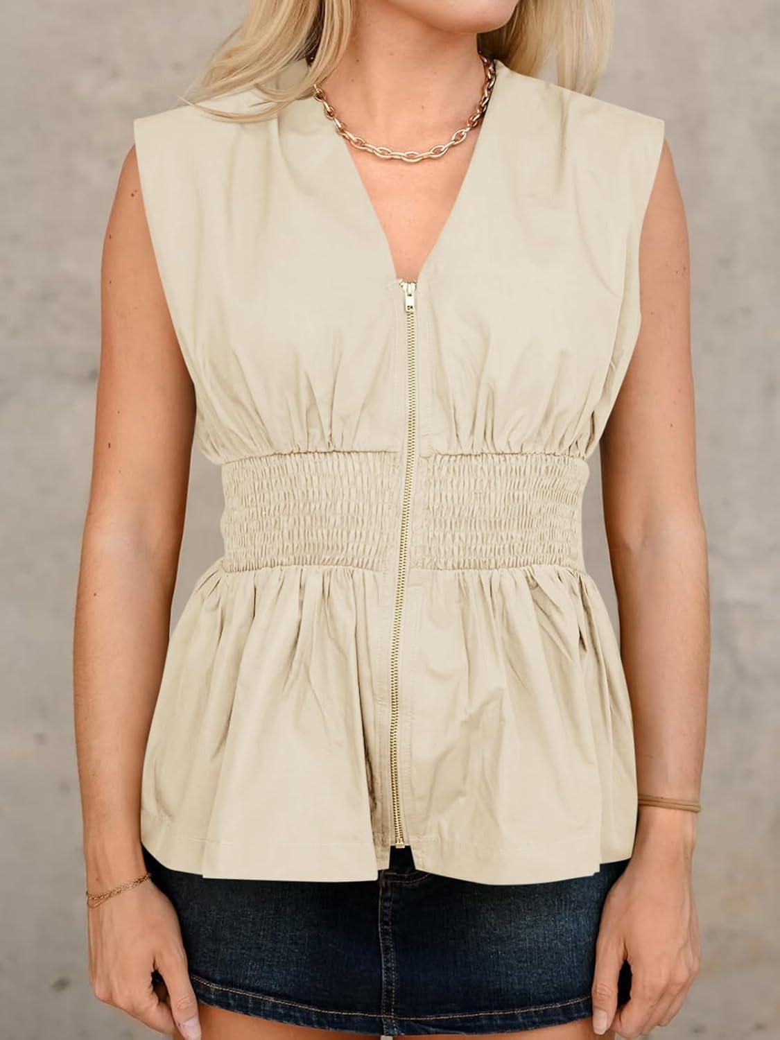 Cicy Bell Womens Summer V Neck Tank Tops Smocked Zipper Sleeveless Vest Pleated Peplum Shirts(Beige)