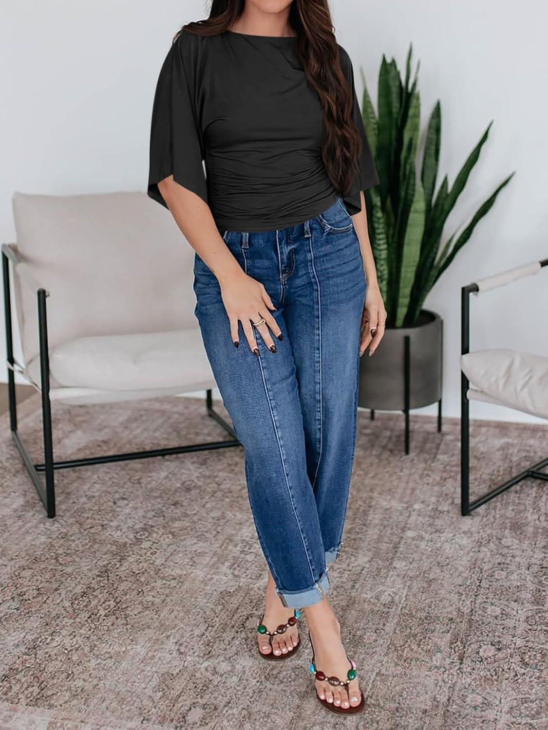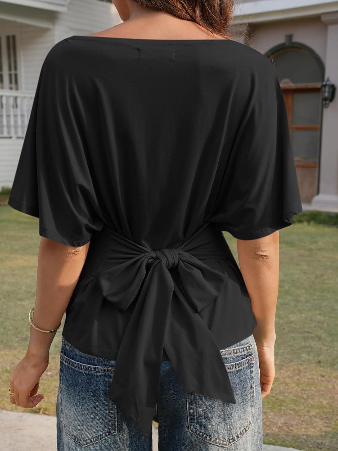 Cicy Bell Womens Summer Wrap Tops Casual Short Sleeve Tie Back Cinched Waist T Shirts Trendy Boat Neck Blouse(Black)