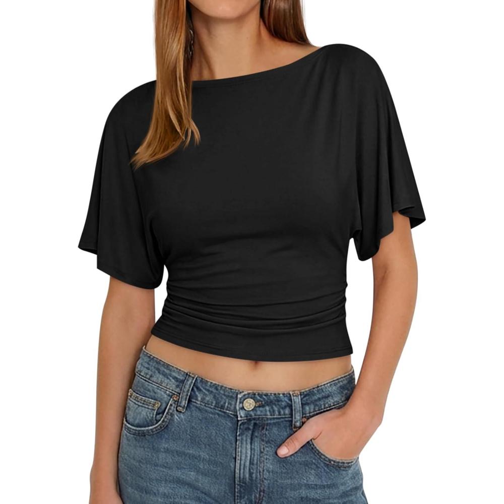 Be the first to review “Cicy Bell Womens Summer Wrap Tops Casual Short Sleeve Tie Back Cinched Waist T Shirts Trendy Boat Neck Blouse(Black)”