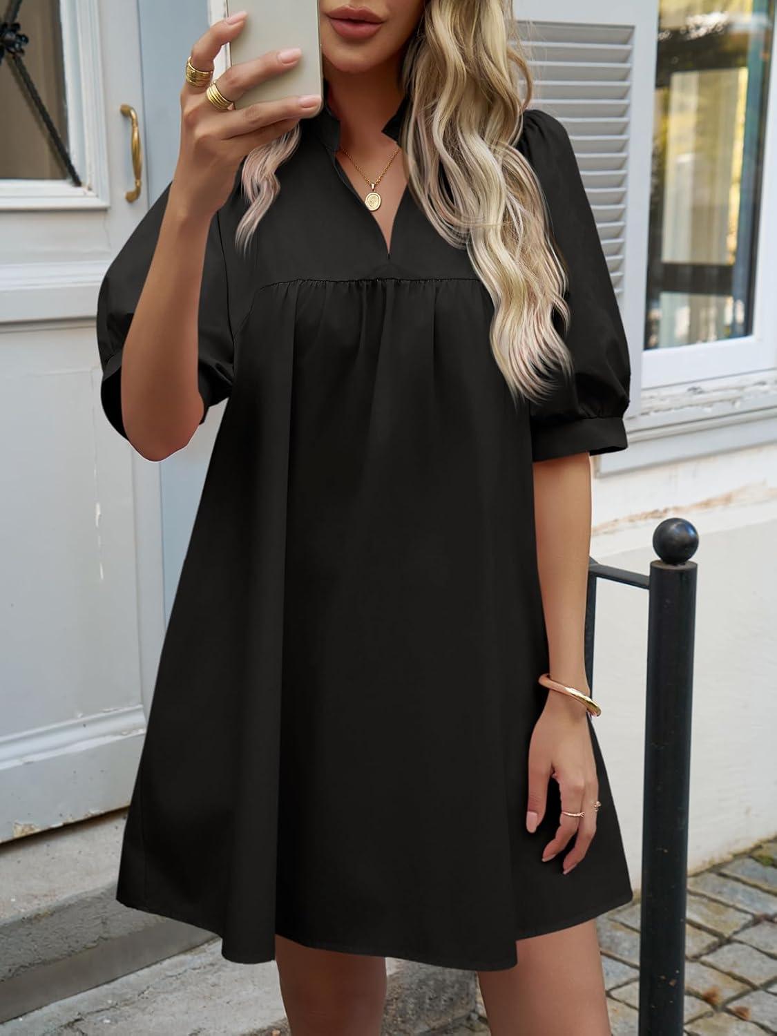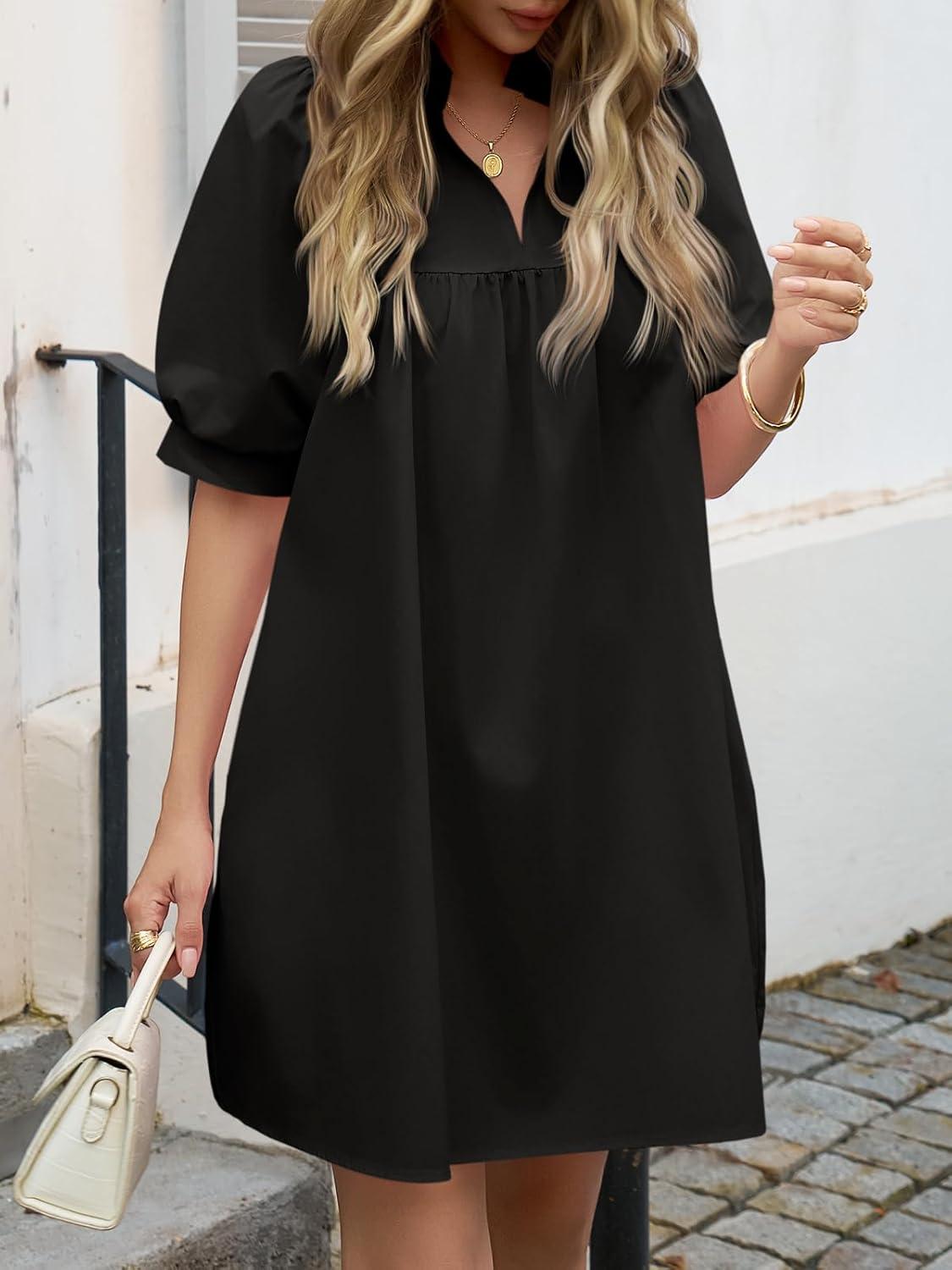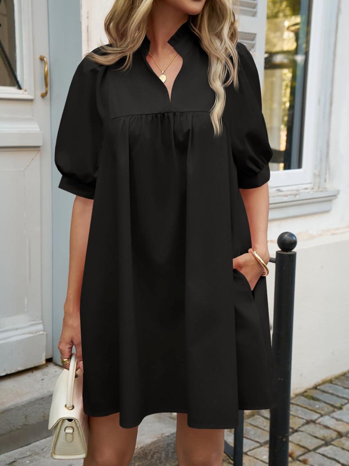 Cicy Bell Womens V Neck Babydoll Mini Dress Short Puff Sleeve Summer Casual Swing Dresses with Pockets(Black)