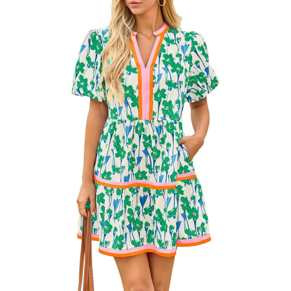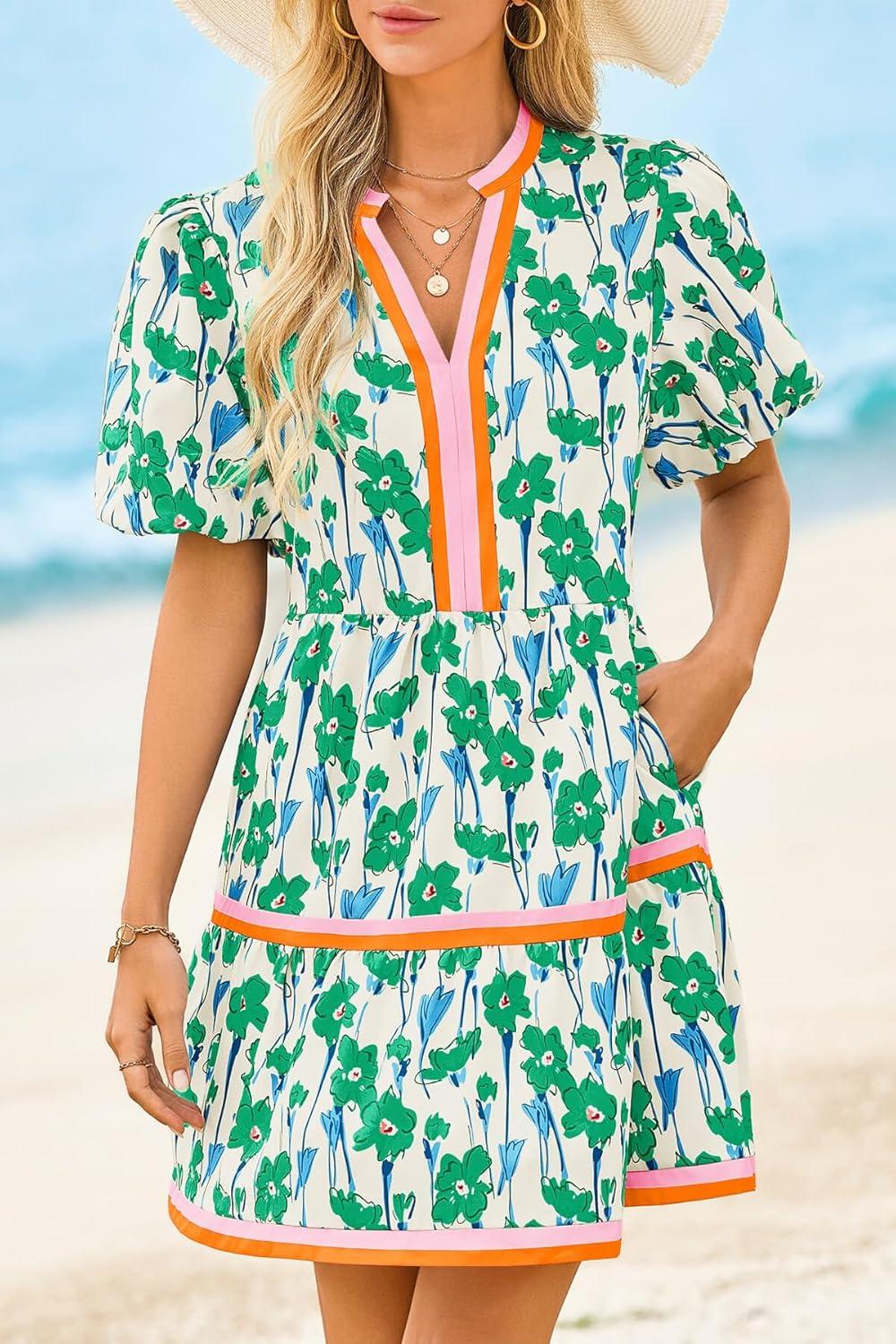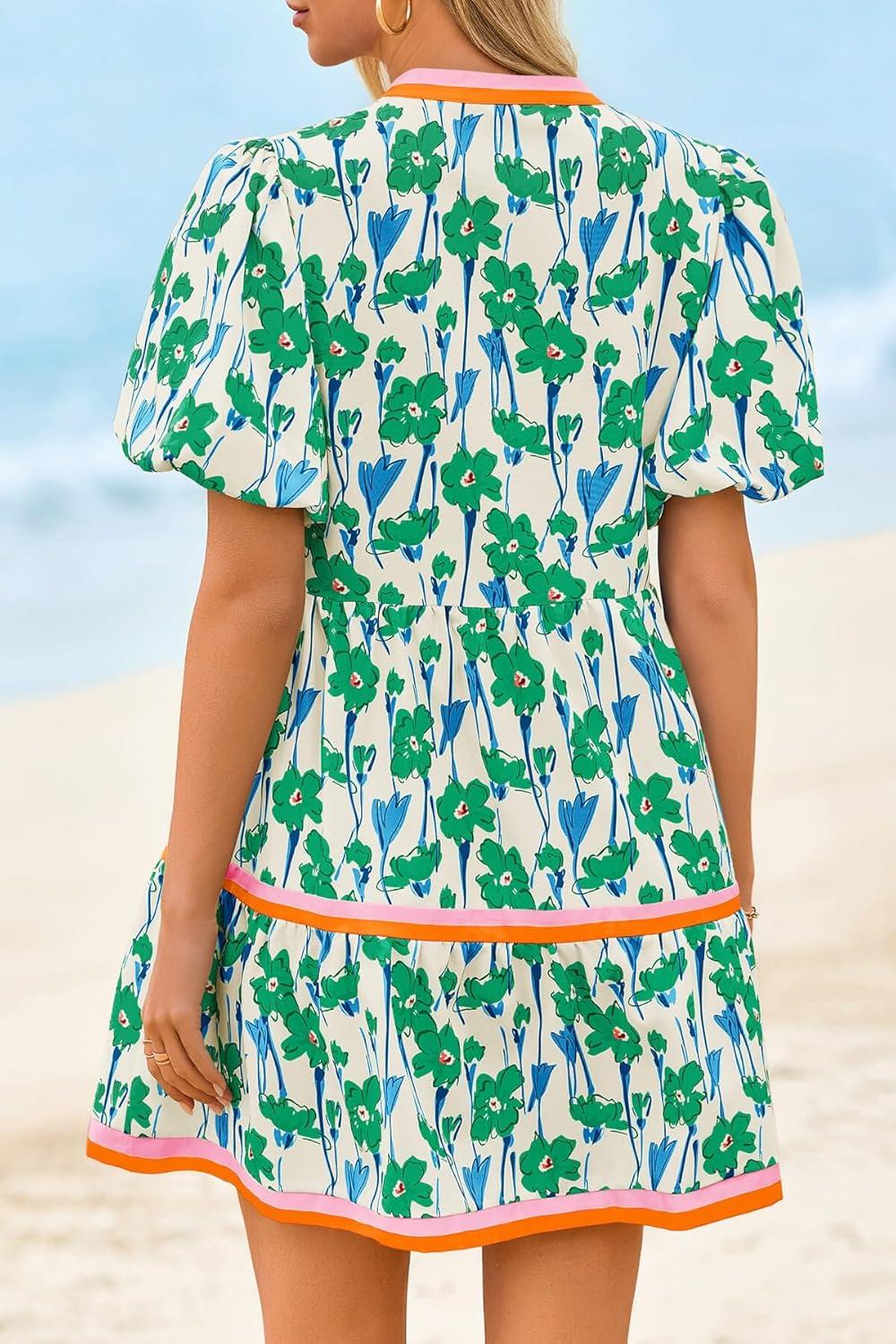 Cicy Bell Womens V Neck Floral Mini Dress Short Puff Sleeve Patchwork Summer Casual Boho Dresses(Green)