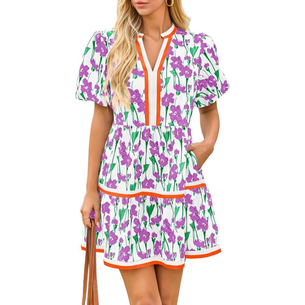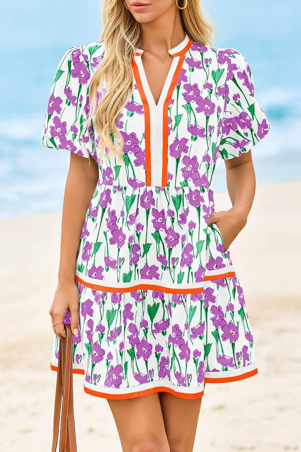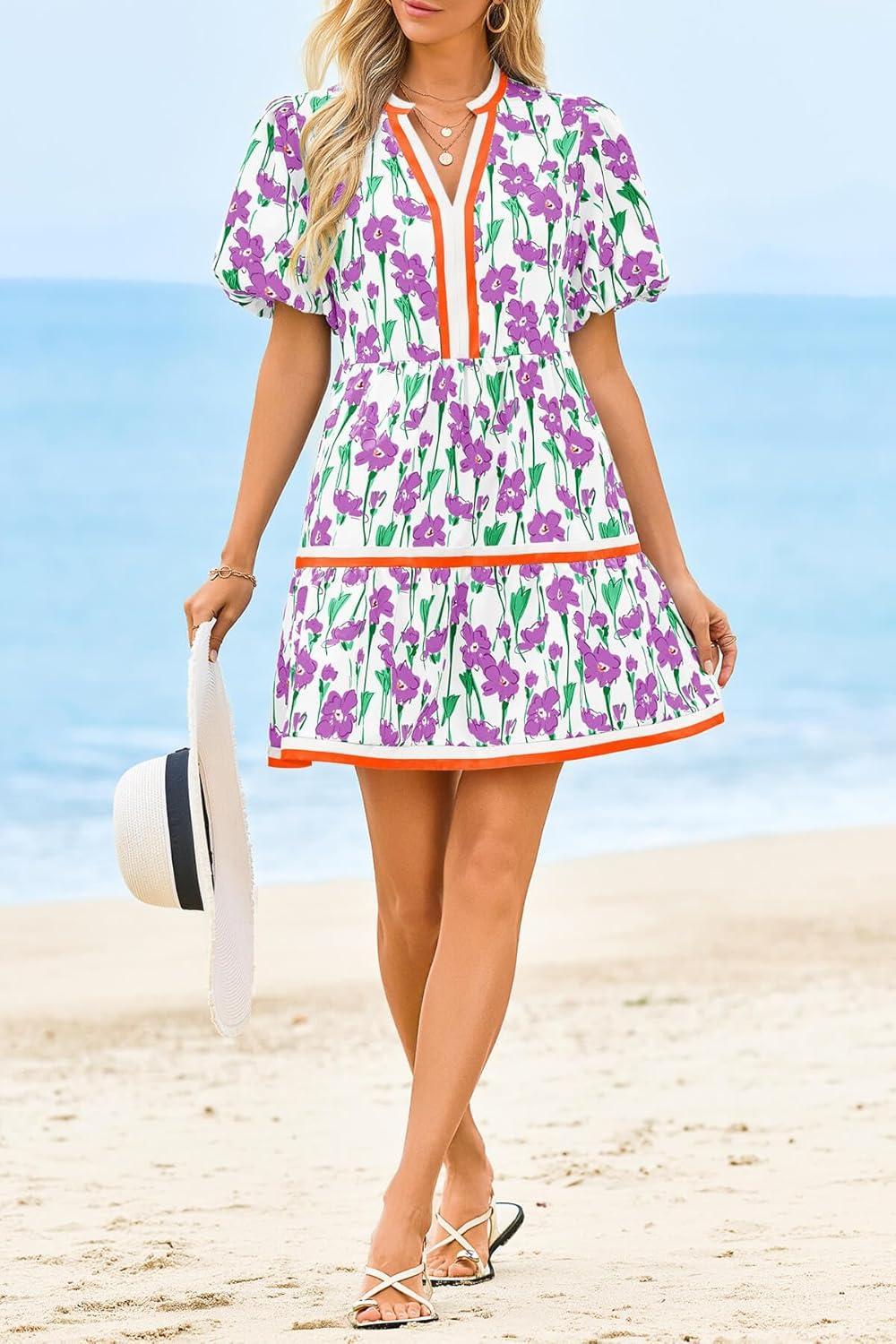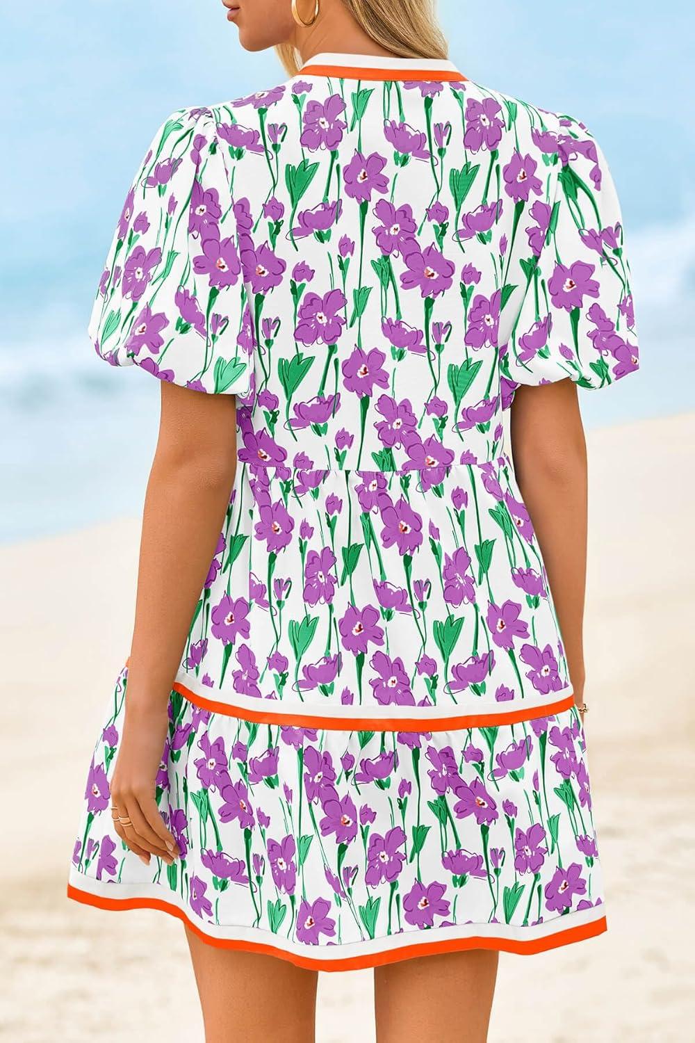 Cicy Bell Womens V Neck Floral Mini Dress Short Puff Sleeve Patchwork Summer Casual Boho Dresses(Purple)