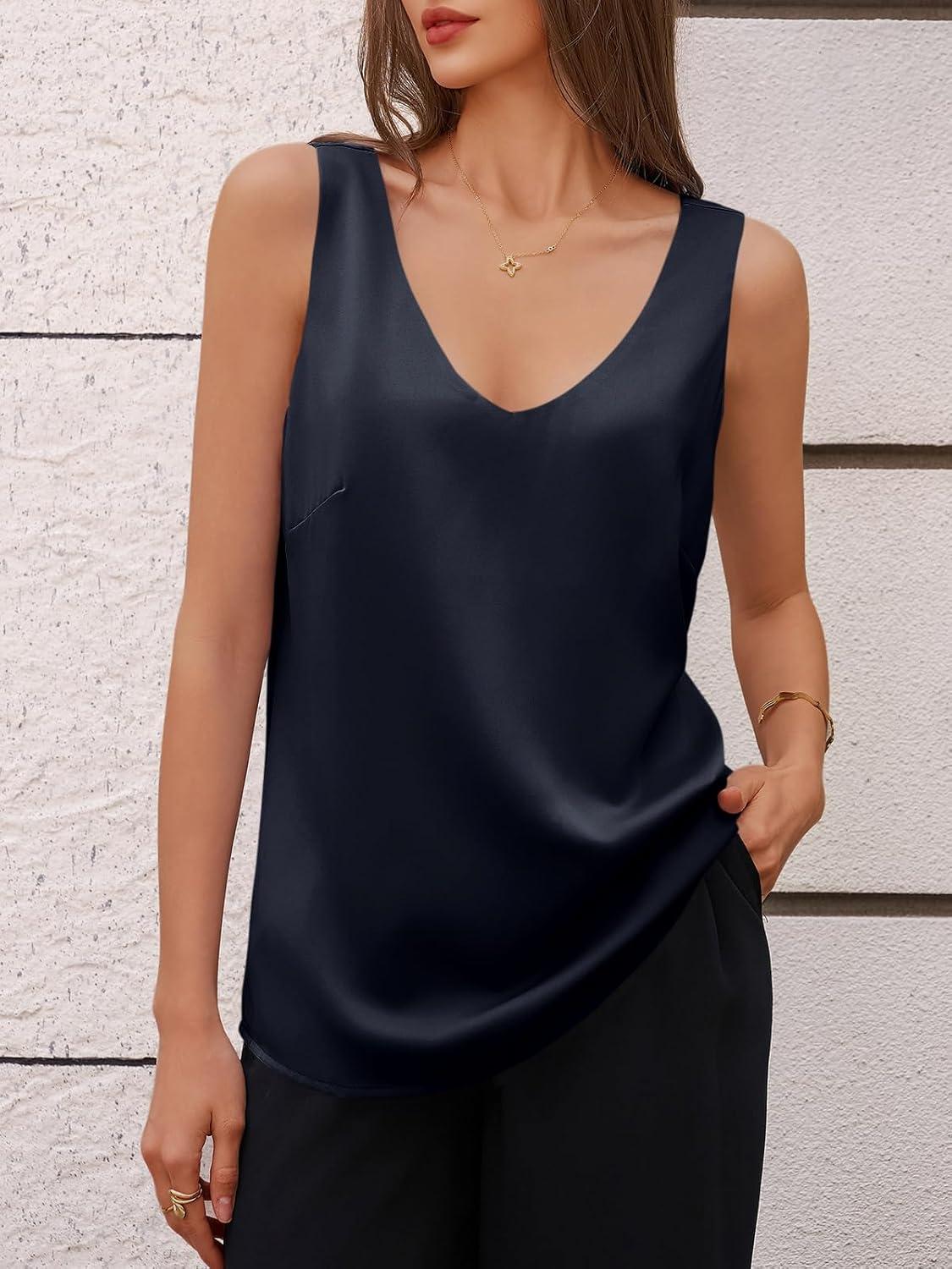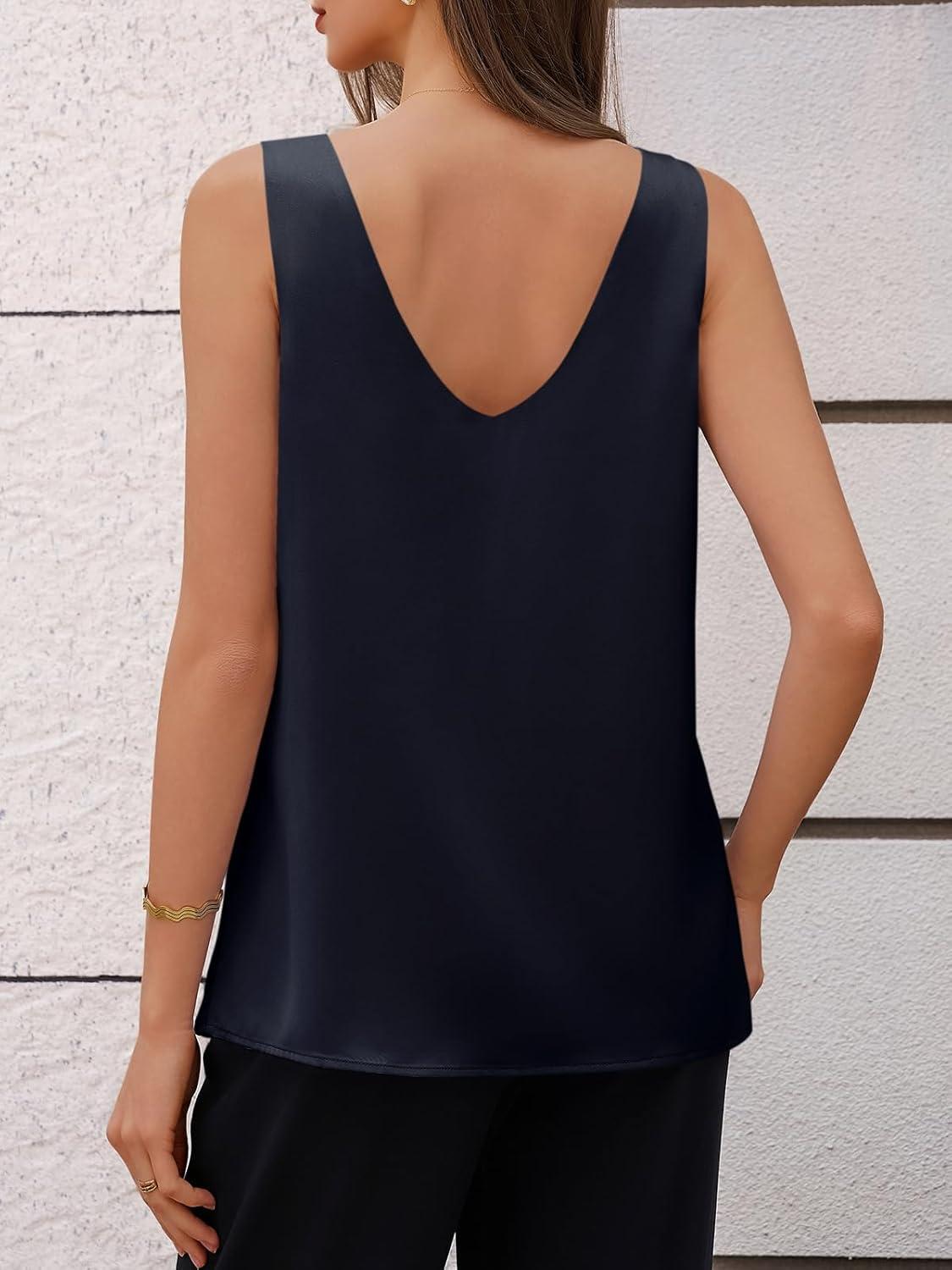 Cicy Bell Womens V Neck Satin Tank Tops Dressy Casual Silk Camisole Blouses Summer Corporate Outfits(Navy)