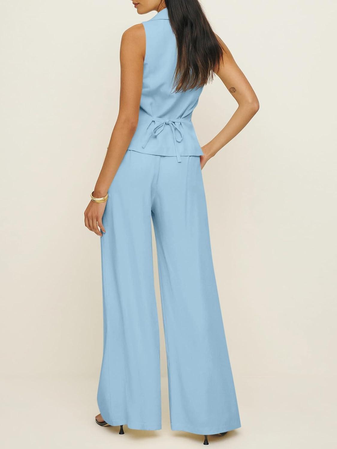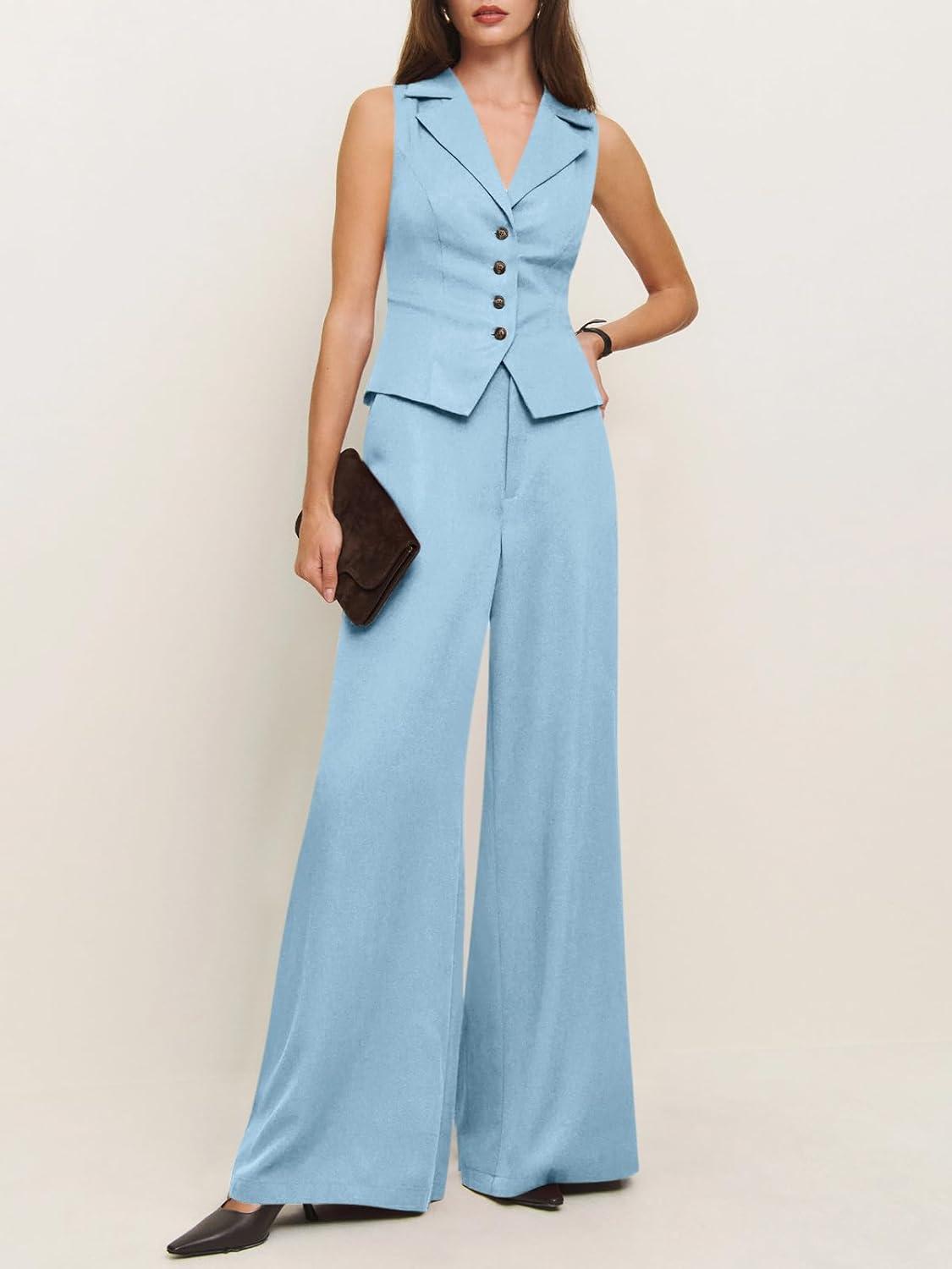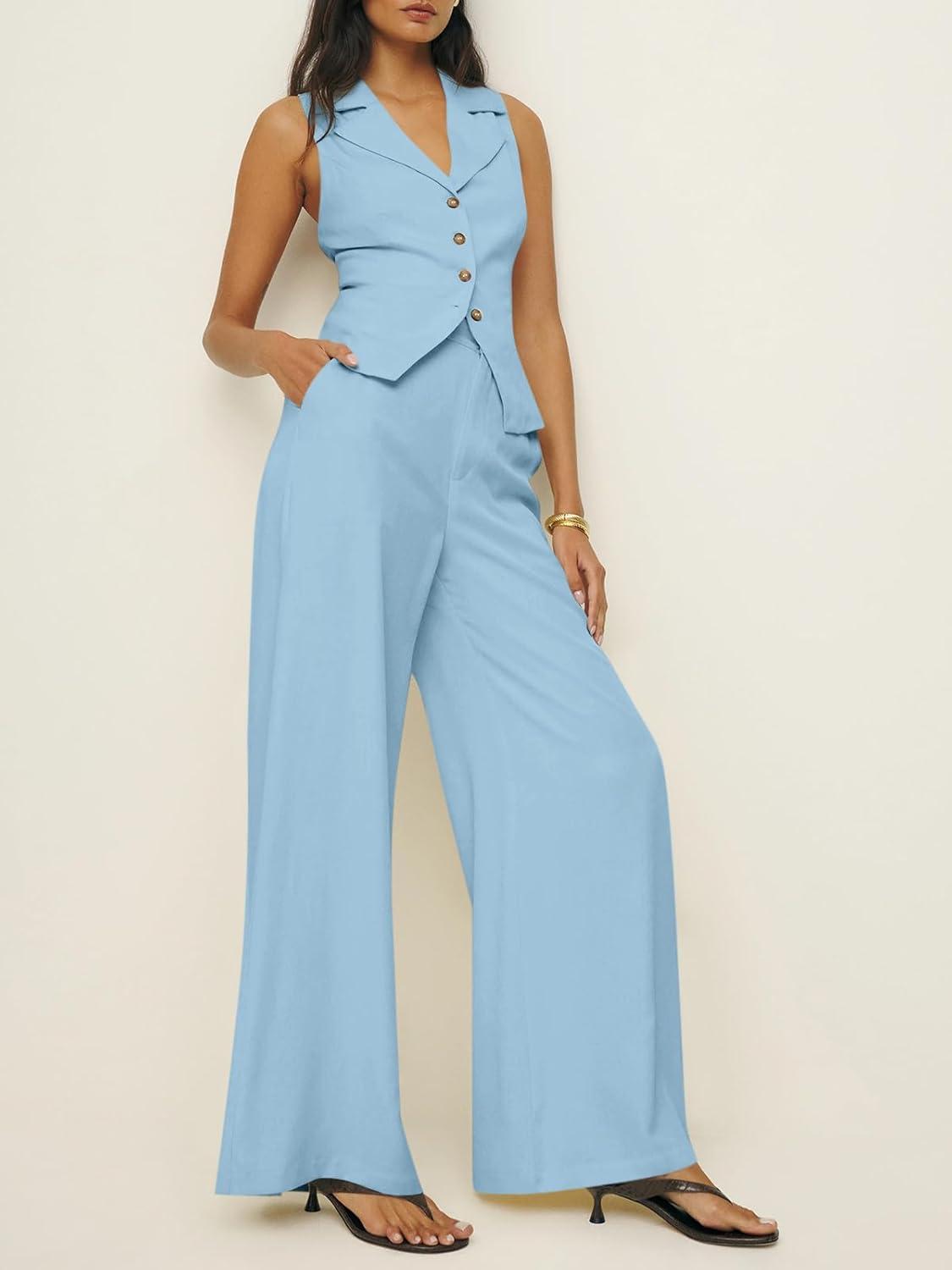 Cicy Bell Womens Vest Sets Summer 2 Piece Outfits Button Crop Blazer Vest and Wide Leg Pant Suits(Light Blue)
