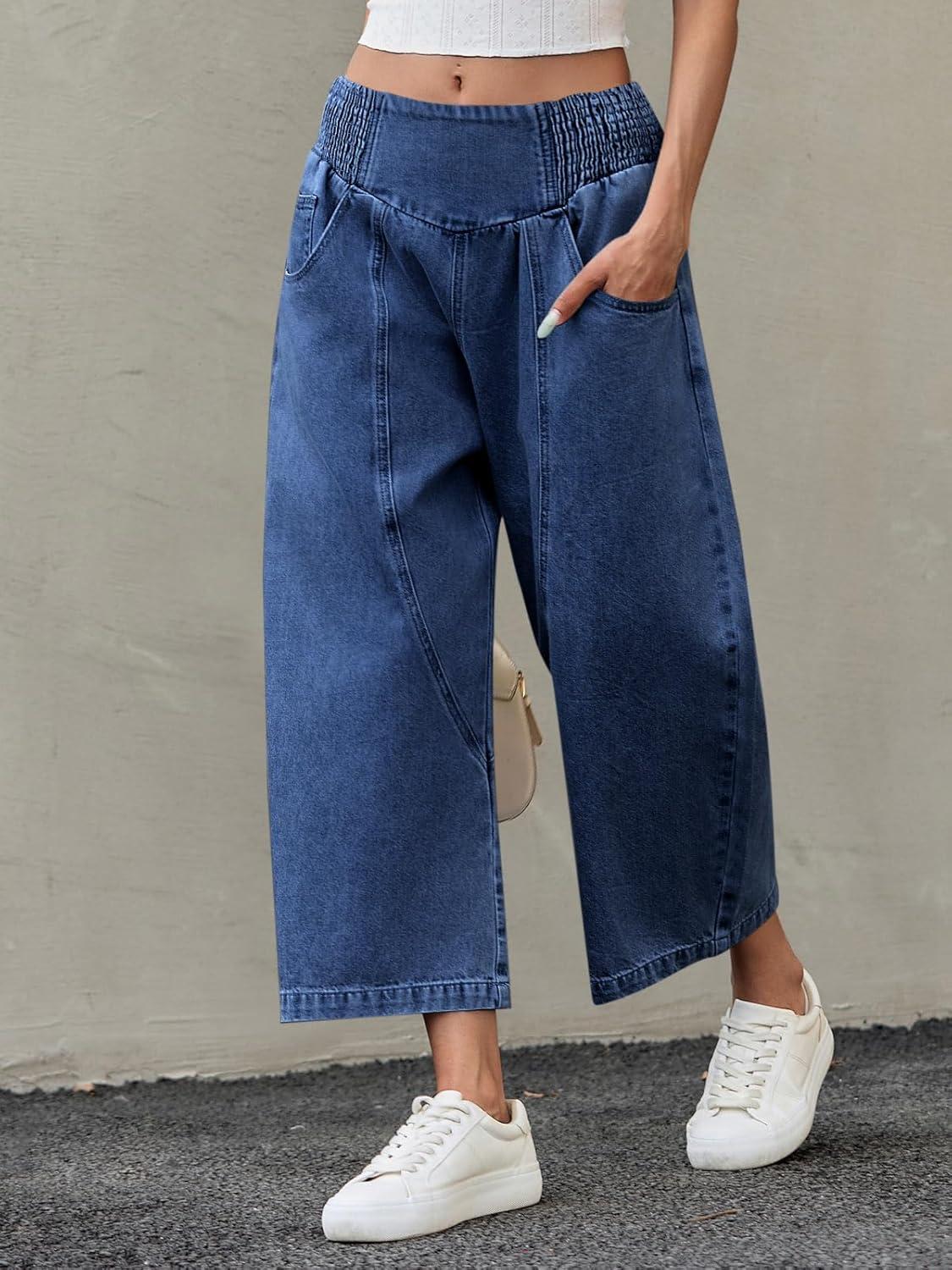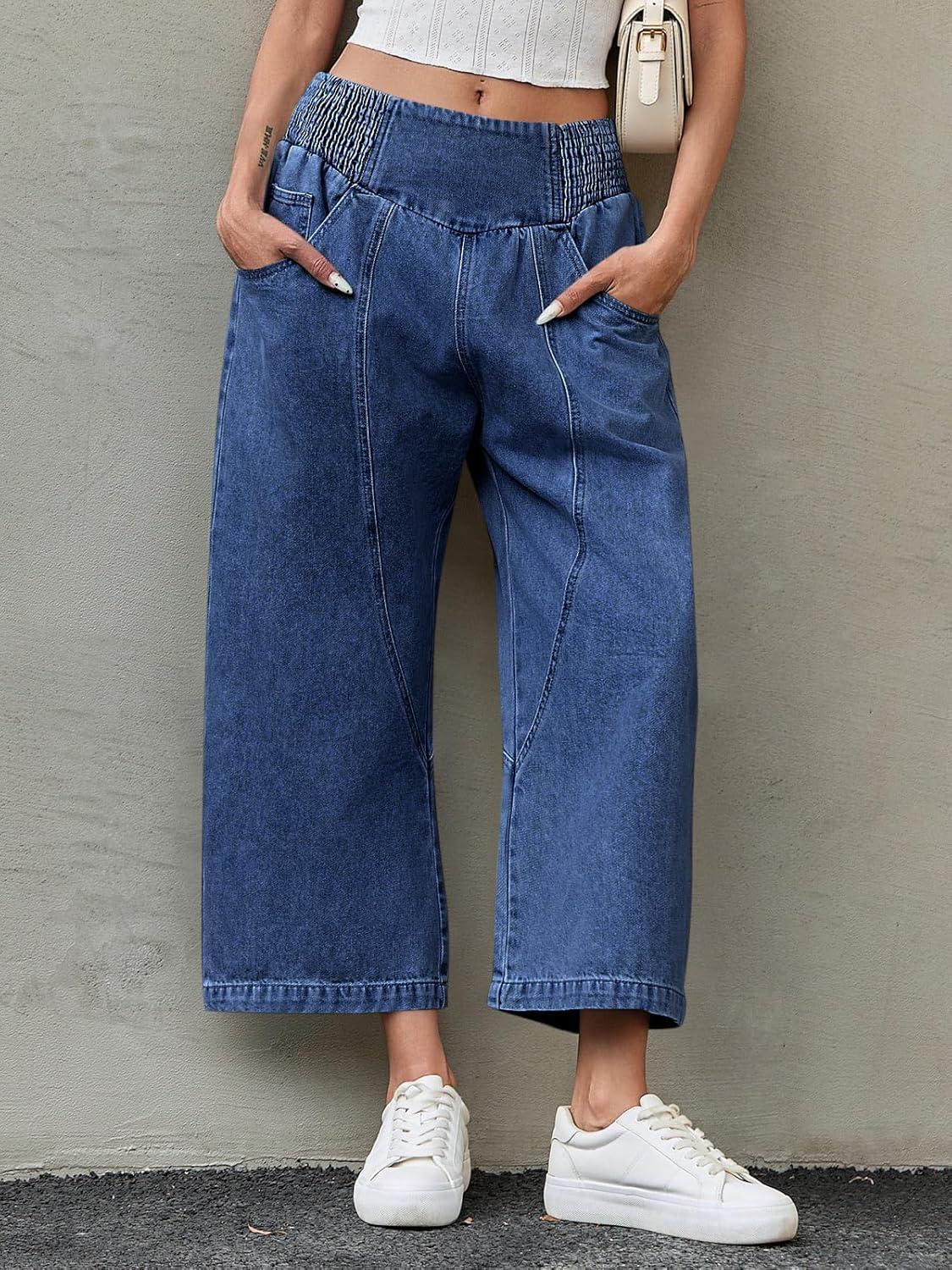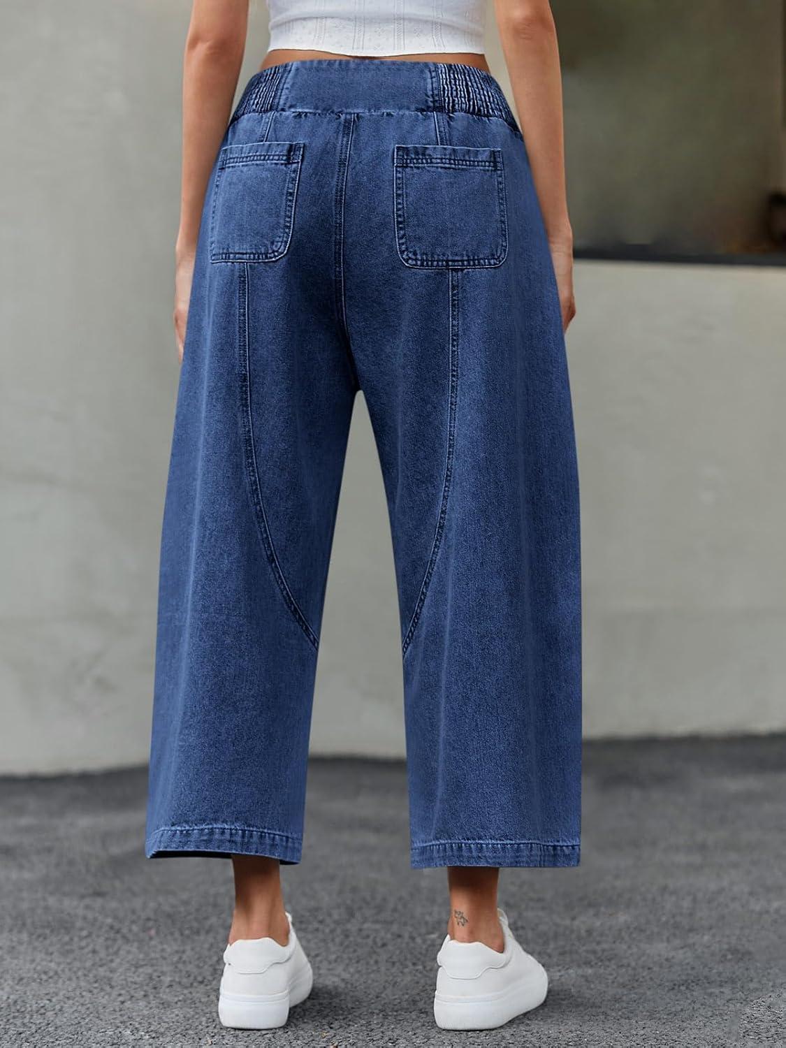Cicy Bell Womens Wide Leg Cropped Jeans Baggy Boyfriend Smocked Mid Rise Harem Denim Pants(Navy)