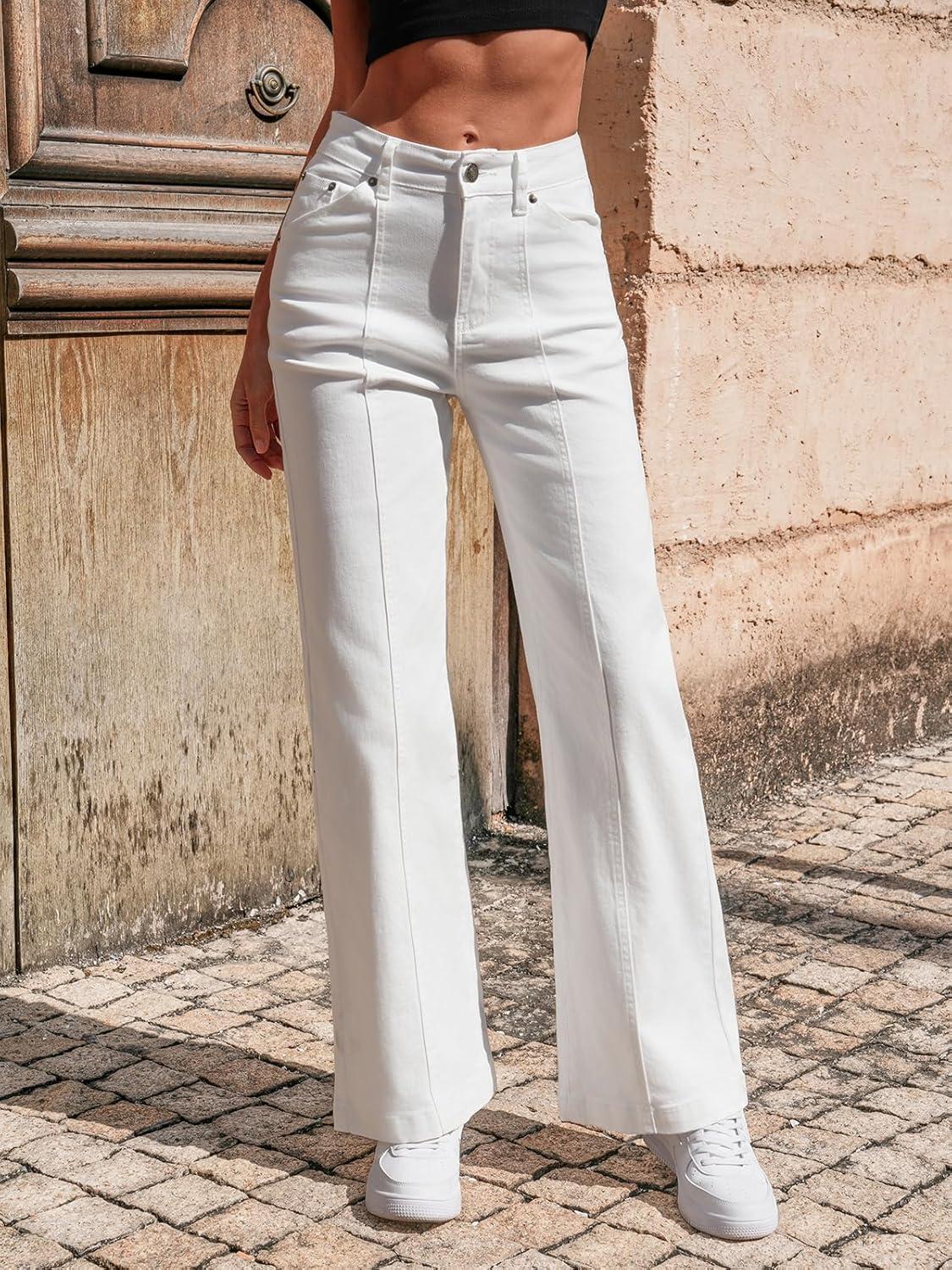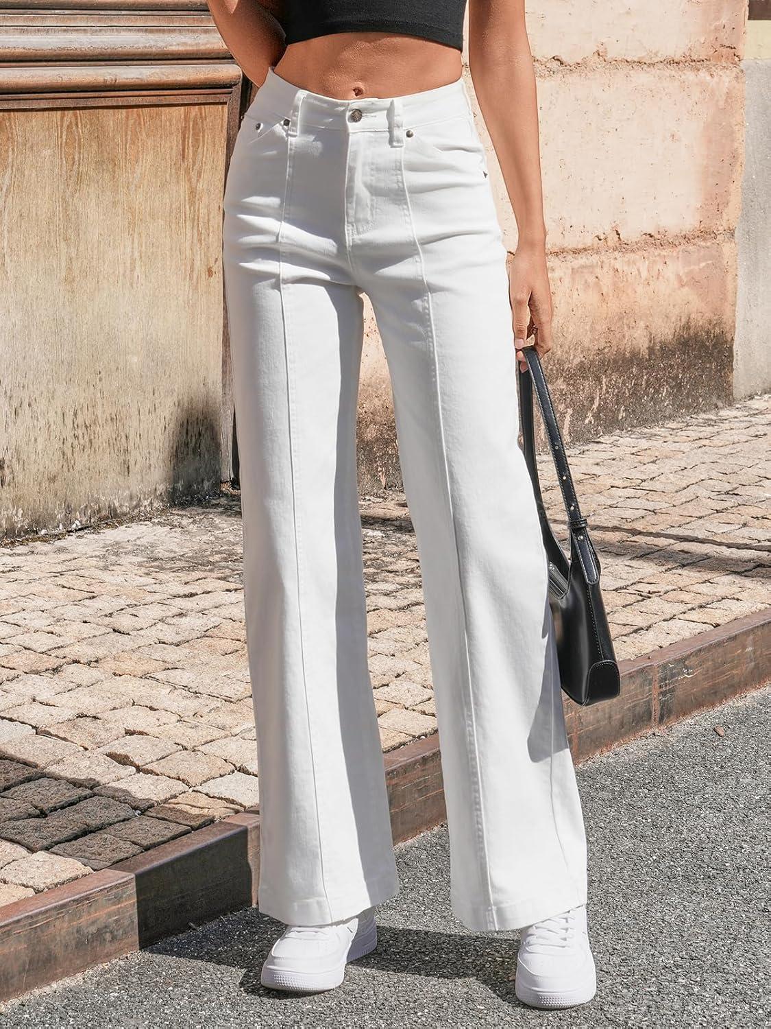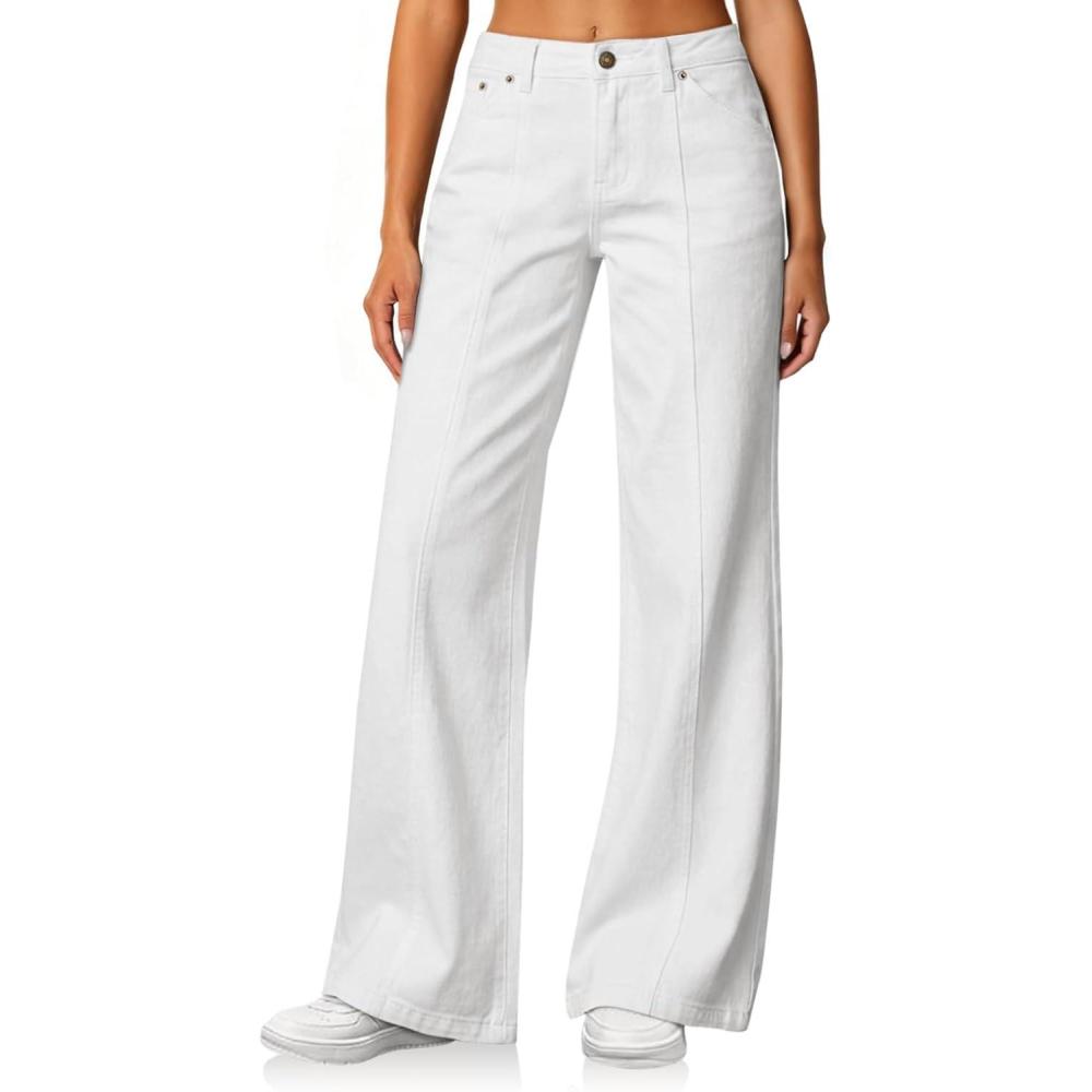 Cicy Bell Womens Wide Leg Jeans High Waisted Baggy Stretchy Front Seam Denim Pants with Pockets(White)